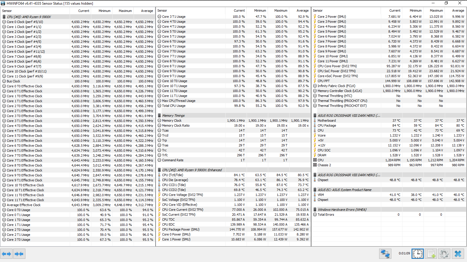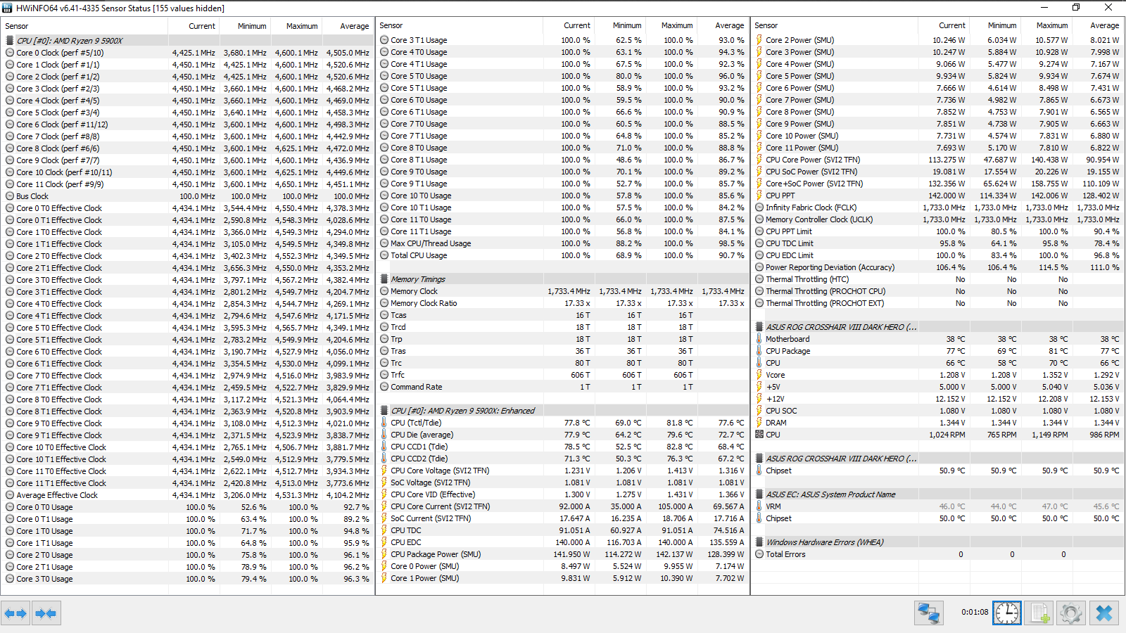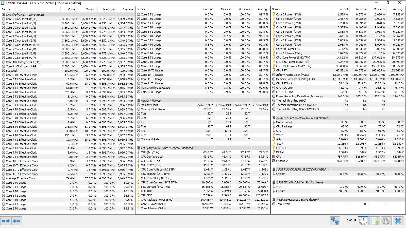 Итоговый результат — 4533 МГц. FCLK равнялся 1800 МГц, а для UCLK (контроллера памяти) форсировался делитель, равный двум. Фактически, был достигнут известный предел для этого набора, полученный в его персонифицированном обзоре.