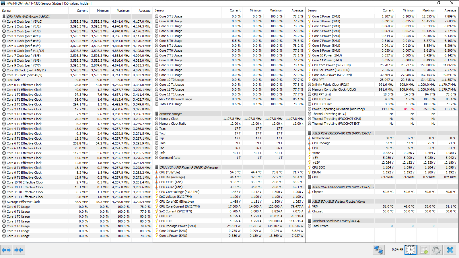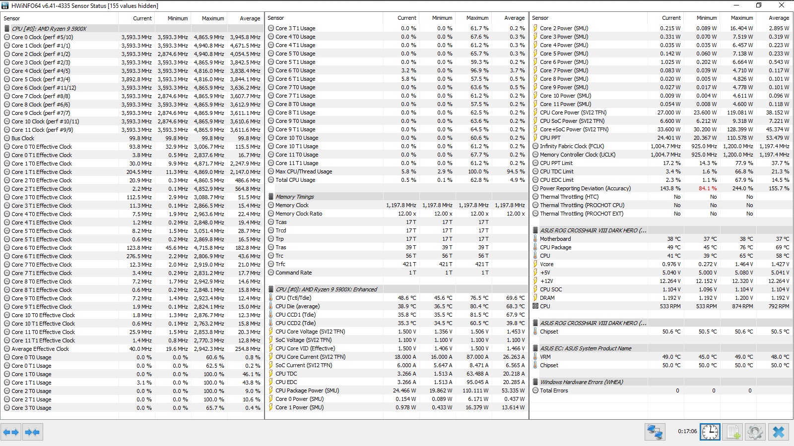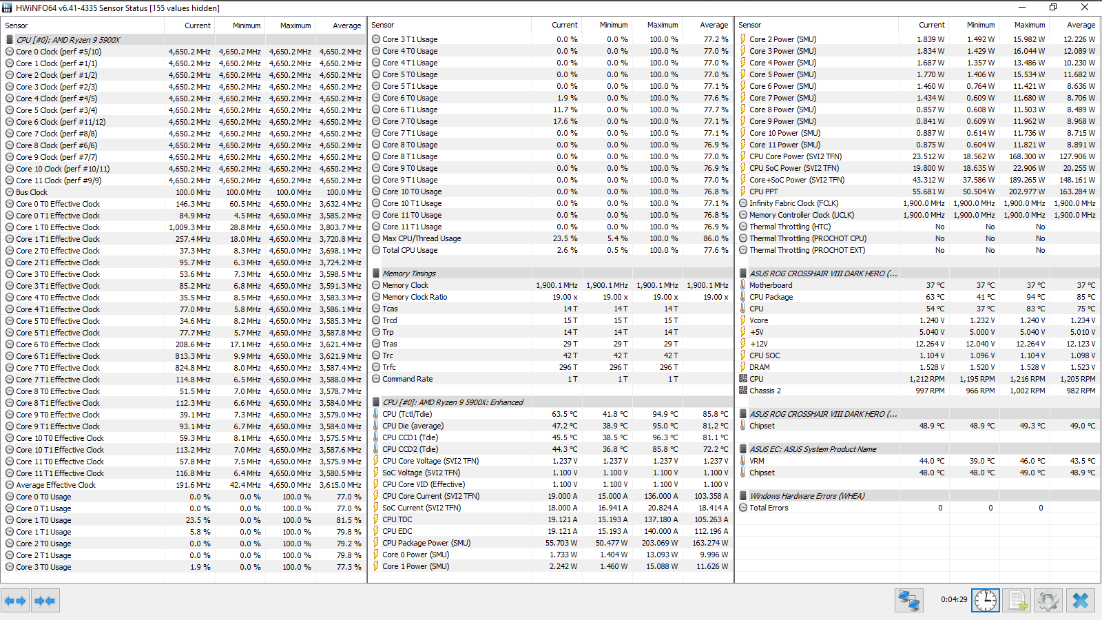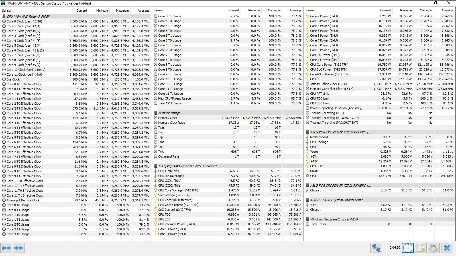 Итоговый результат — 4533 МГц. FCLK равнялся 1800 МГц, а для UCLK (контроллера памяти) форсировался делитель, равный двум. Фактически, был достигнут известный предел для этого набора, полученный в его персонифицированном обзоре.