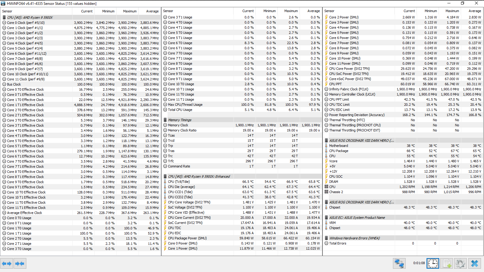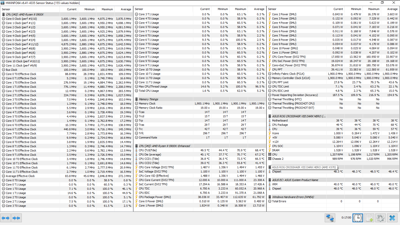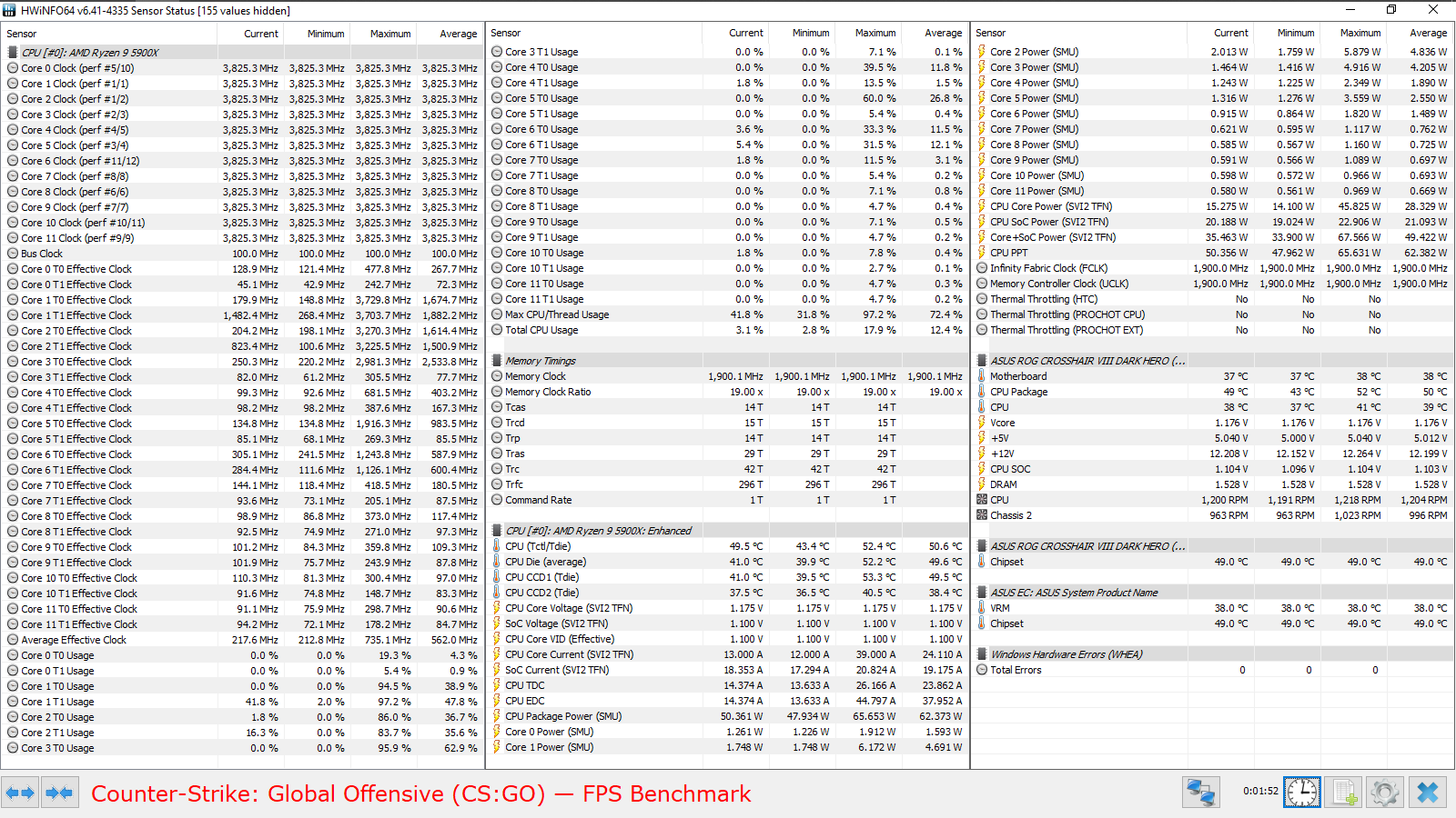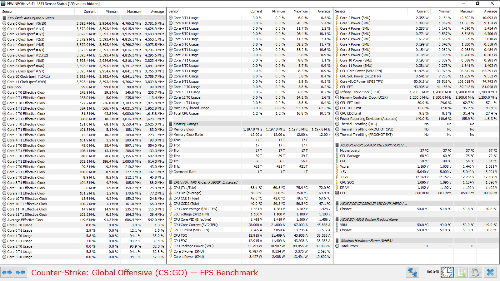 Все эксперименты проводились с прошивкой 3003 (AMD AGESA ComboAM4v2PI 1.1.8.0), обновление данных в HWiNFO64 происходило с периодичностью 500 мс (Pooling Period). Тест кадровой частоты FPS Benchmark в CS:GO запускался со следующими настройками — 1, 2.