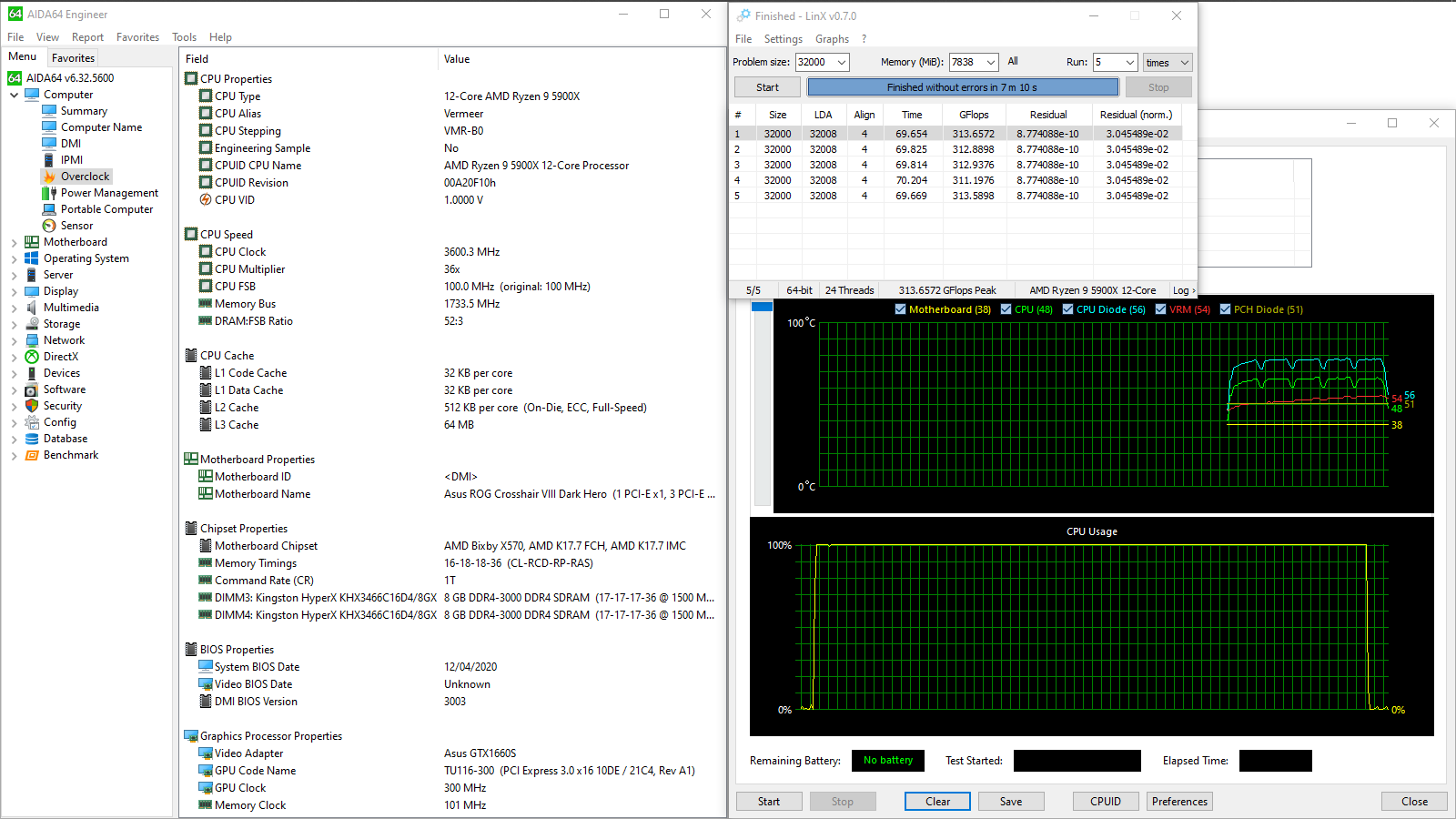 GFlops Peak — 313,66. AIDA64 Cache & Memory Benchmark Latency — 60,3 ns. Memory Read — 52110 MB/s.