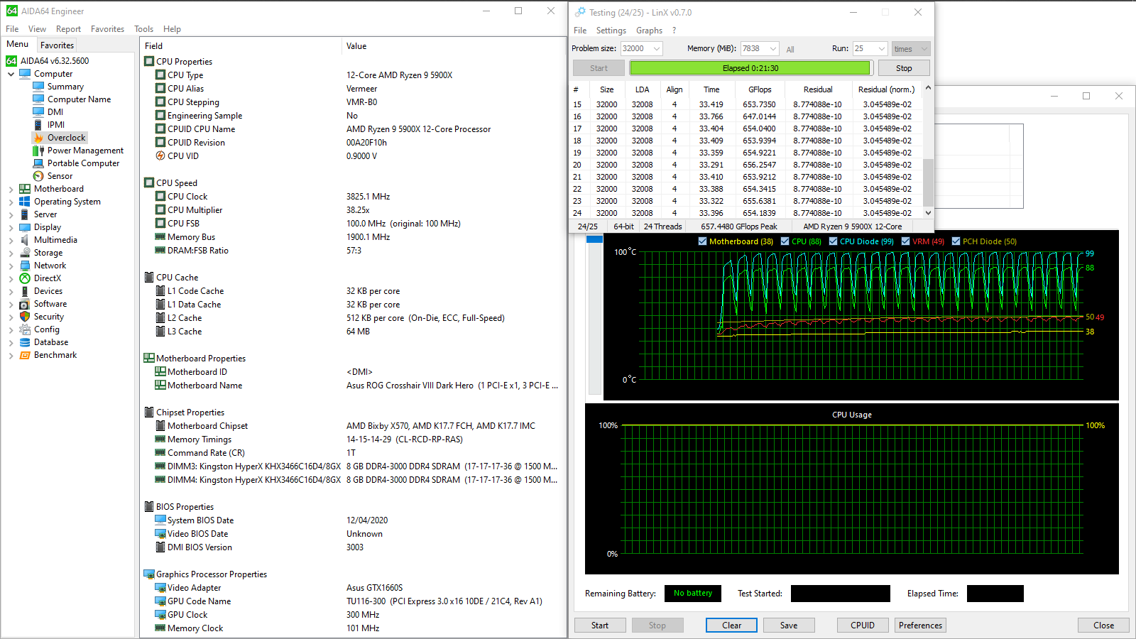LinX v0.7.0 (25 Runs, Problem size: 32000). VRM Sensor (max) — 49 °C. CPU Package (avg/max) — 88/99 °C.