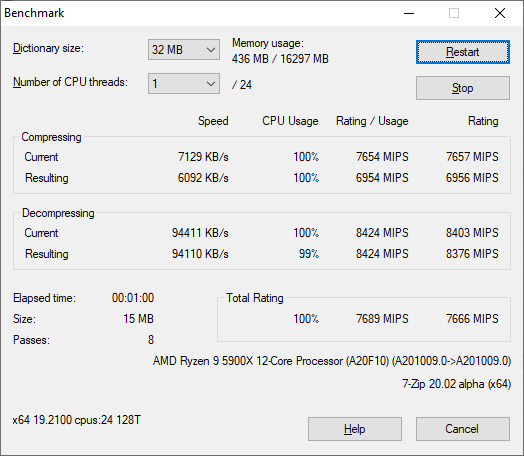 1/24 threads (7-Zip 20.02 alpha (x64) Benchmark) CPU Clock (max) — 4300 МГц. CPU Package (max) — 56 °C.