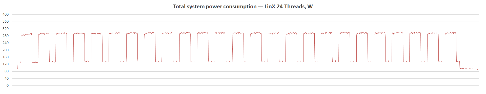 Граничные уровни потребления энергии — 91–302 Вт. Во время экспериментов температура окружающей среды равнялась 26 градусам. Собственные замеры пирометром тыльной стороны платы в секторе размещения элементов VRM совпали с данными, отображаемыми датчиком на плате. Стабилизация напряжения буквально образцовая.