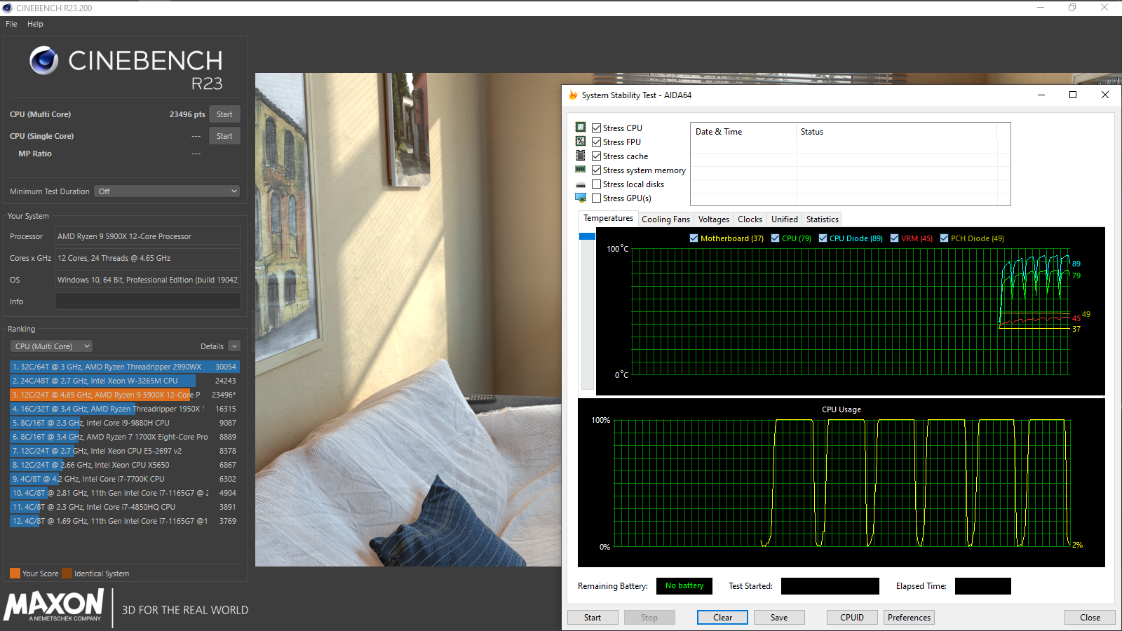 Тестовый Ryzen 9 5900X может ускориться до 4650 МГц при использовании шести подряд проходов бенчмарка Cinebench R23 в качестве идентификатора стабильности ПК. Требуется определить необходимый и достаточный режим работы стабилизатора. Конечные параметры, добавленные к разгону ОЗУ: CPU Voltage — 1,2375 В, CPU LLC — Level 5.