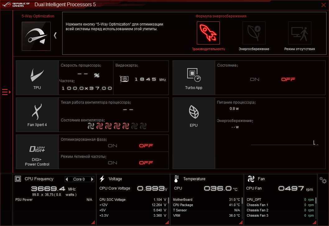 В среде Ai Suite 3 доступен мастер по наладке системы DIP 5 (Dual Intelligent Processors 5), внизу главного окна находится масса переменных для наблюдения, но чего-то нового относительно UEFI там не найти, к примеру, сенсор температуры хаба не афишируется.