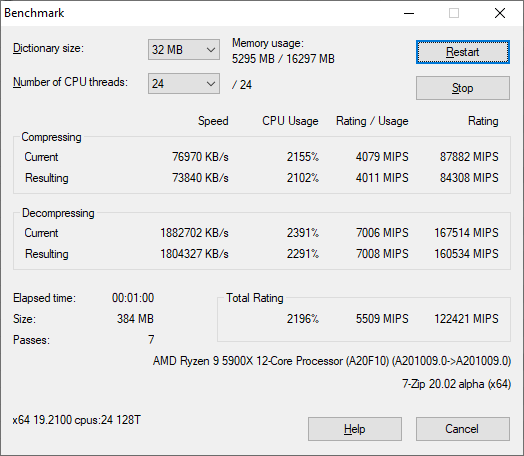 1/24 threads (7-Zip 20.02 alpha (x64) Benchmark) CPU Clock (max) — 4650 МГц. CPU Package (max) — 76 °C.