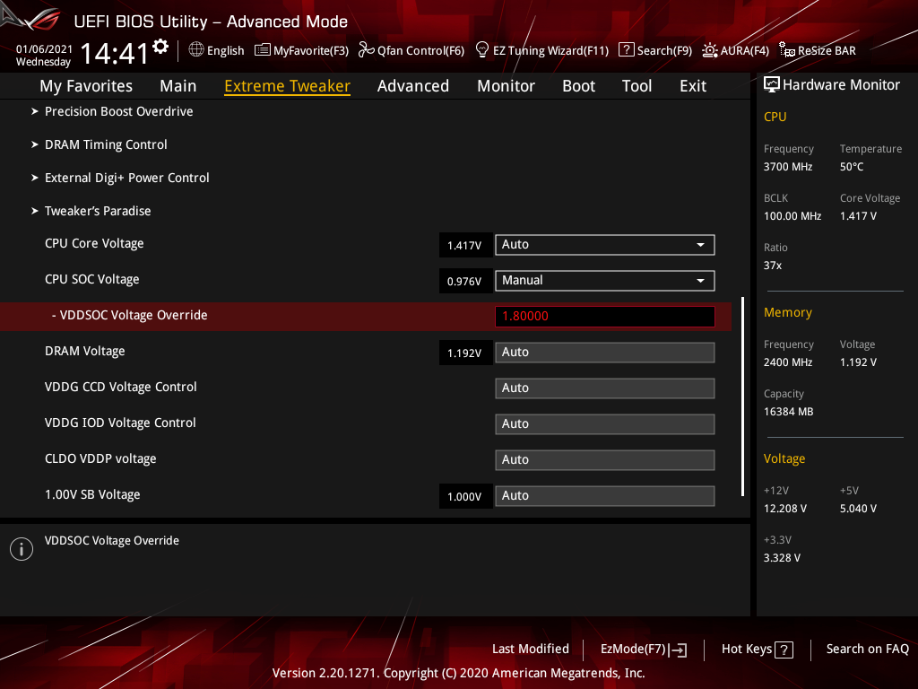 | VDDSOC Voltage Override (В) | 0,75–1,80 | 0,00625 |