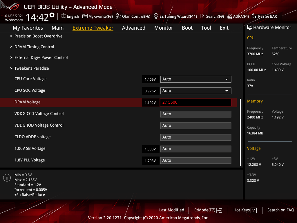| DRAM Voltage (B) | 0,5–2,155 | 0,005 |