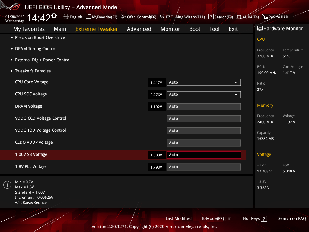 | 1.00V SB Voltage (В) | 0,7–1,6 | 0,00625 |