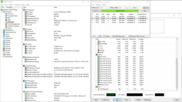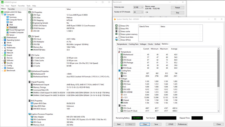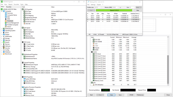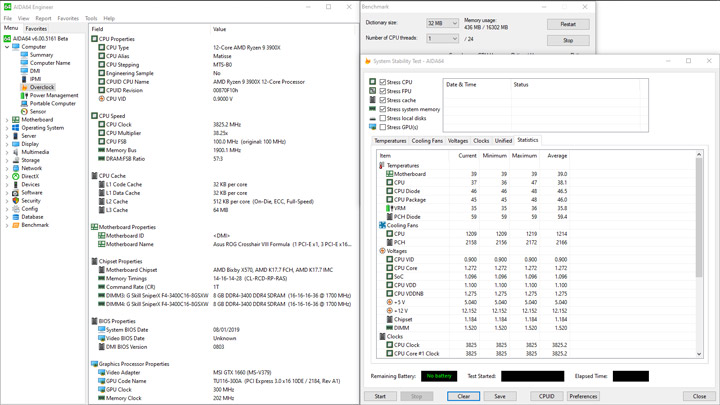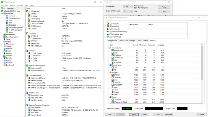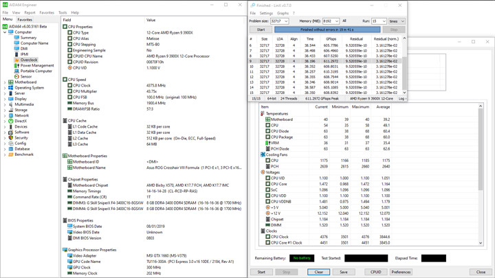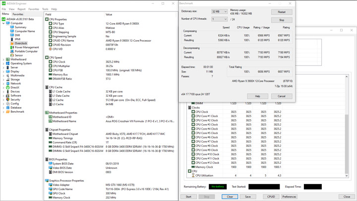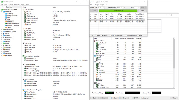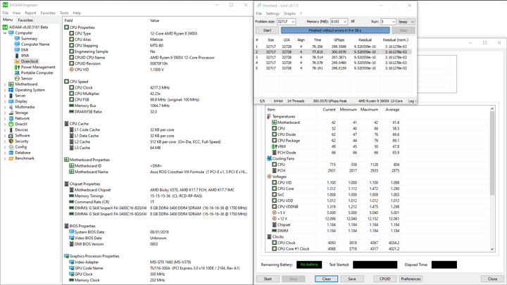 Пиковой частотой на самом быстром ядре оказались 4517 МГц, средней отметкой — чуть больше 4,3 ГГц, это можно было видеть в однопоточном сценарии Cinebench R15. Для архивации пик меньше — 4467 МГц, зато больше средняя величина — 4334 МГц, если говорить про работу с одним потоком. Для 24 потоков цифры снизятся до пиковых 4167 МГц в архивации, в среднем вышло около 4080 МГц. Более любопытной картина получилась при рендере — достаточно чутко пиковые и средние частоты распределились между двумя CCD, первый (из двух) работал быстрее, иногда ускоряясь до 4442 МГц. Напряжение CPU VDD в AIDA64 до сих пор соответствует действующему для SOC, а CPU VDDNB — на вычислительных ядрах процессора. Рост доходил до 1,488 В. С привлечением инструкций AVX рабочие сценарии понизят среднее значение частоты до 4020 МГц. Более детально различные параметры системы можно изучить на скриншотах. Температура Ryzen 9 3900X в общем итоге не превысила 73 градусов для рядовых сценариев и 76 °C в случае функционирования LinX.