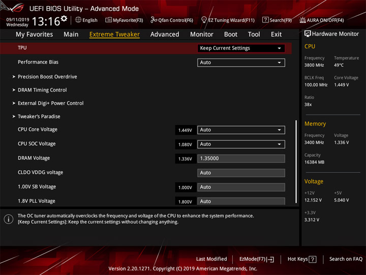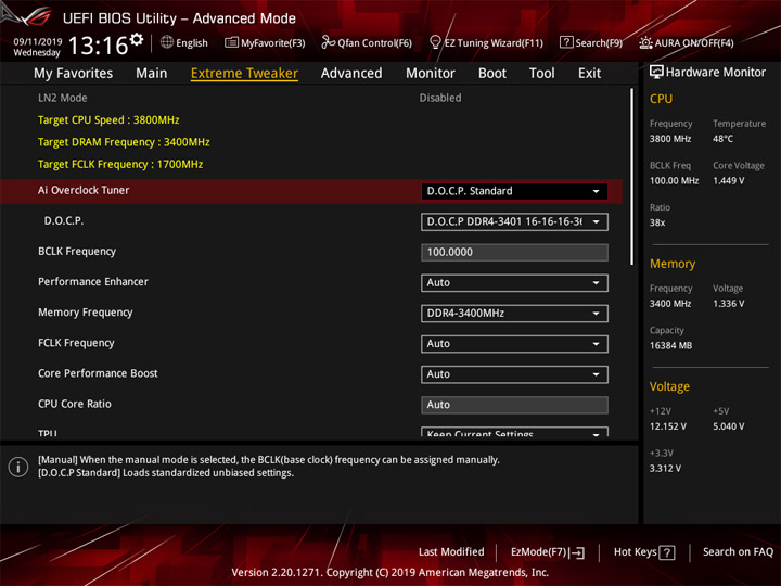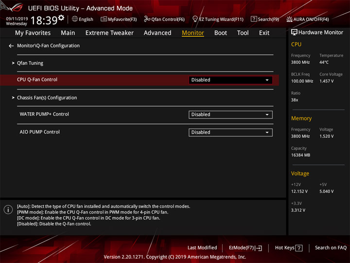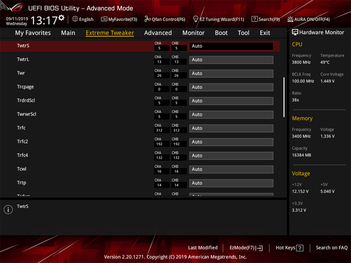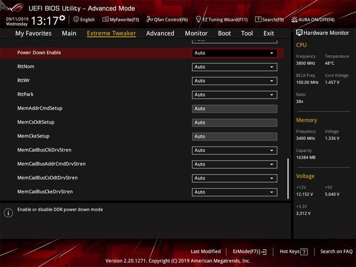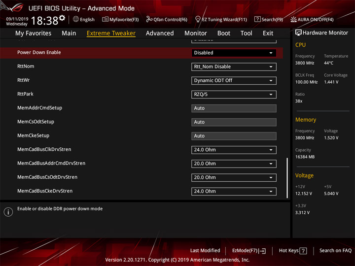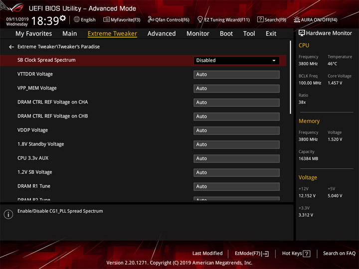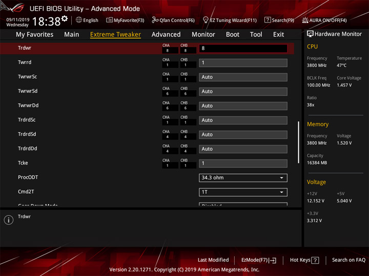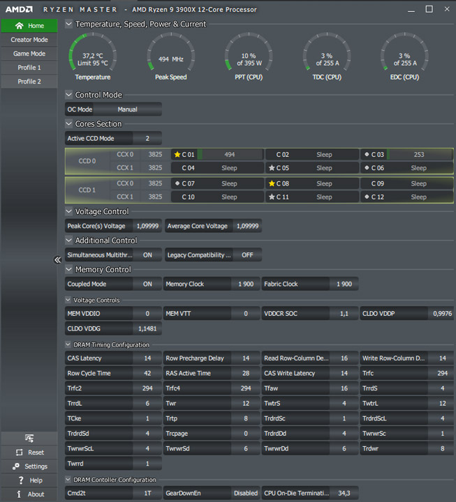 О методах ускорения двенадцатиядерного Ryzen 9 3900X речь шла в одном из наших прошлых материалов, потому не стану повторять уже сказанное там, а эксперименты начну с максимального ускорения ОЗУ. Цель — 3800 МГц в режиме 1:1 с Fabric (FCLK = 1900 МГц). Также важны второстепенные задержки, которые будут ускорять компьютер в ряде задач куда больше, чем отлаженный процессор. Так, низкое значение tFAW даст огромный прирост производительности в LinX, который в общем итоге составит более 100%, как бы странно это не казалось на первый взгляд. Для стендового комплекта потребовалось установить на модулях 1,53 В, имеющих тенденцию к понижению после фиксации отметки в UEFI. Для SOC достаточными были 1,1 В, но здесь уже потребовалось активировать лучший профиль LLC для стабилизации величины в ходе выполнения нагрузочных сценариев LinX. Также я отключил Spread Spectrum, дабы базовая частота приобрела вид 100 МГц. Ещё отключался CPU Q-Fan Control, чтобы формула по снижению оборотов частоты процессорного вентилятора не исказила возможно лучшие результаты вычислений.