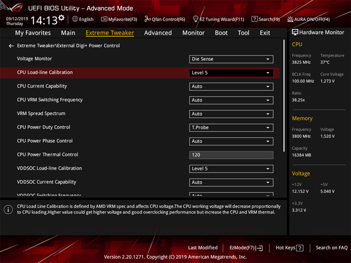 Возвращаясь к рассмотрению предмета обзора, я произвёл разгон ЦП до предельного, чтобы создать для VRM наибольшую нагрузку. Ограничителем выступила температура процессора, в разумных рамках набор из множителя и уровня напряжения для испытаний с LinX составил пару из x38.25 и 1,275 В. Теперь нужно было активировать LLC и для CPU Voltage, максимальный, пятый профиль справился с поставленной целью.
