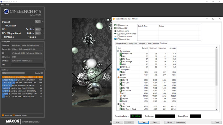 Предельно стабильной величиной частоты процессора для более слабой нагрузки оказались 4325 МГц, при максимально ускоренной DRAM. Правда, для этого пришлось нарастить напряжение уже до заметных 1,3875 вольт. Актуальными были выставленные профили LLC, как и все прочие настройки из предыдущего цикла тестов.