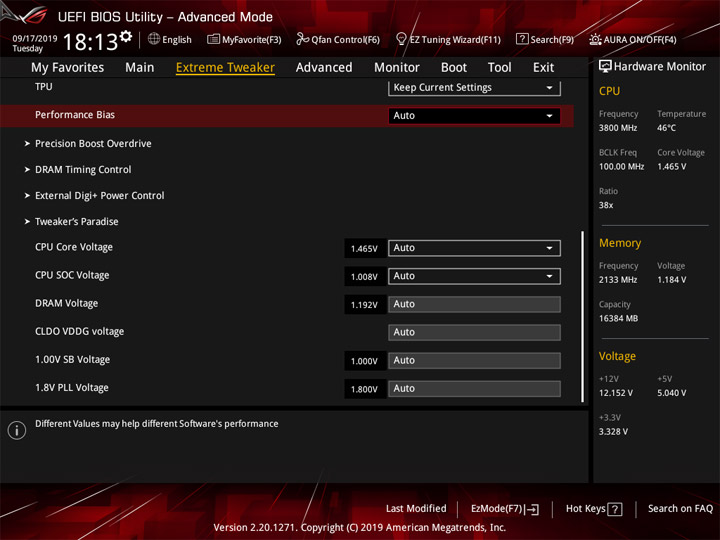 Проверим поведение компьютера с начальными настройками, частота DRAM — 2133 МГц. Напряжение SOC около одного вольта, на модулях — 1,184 В.