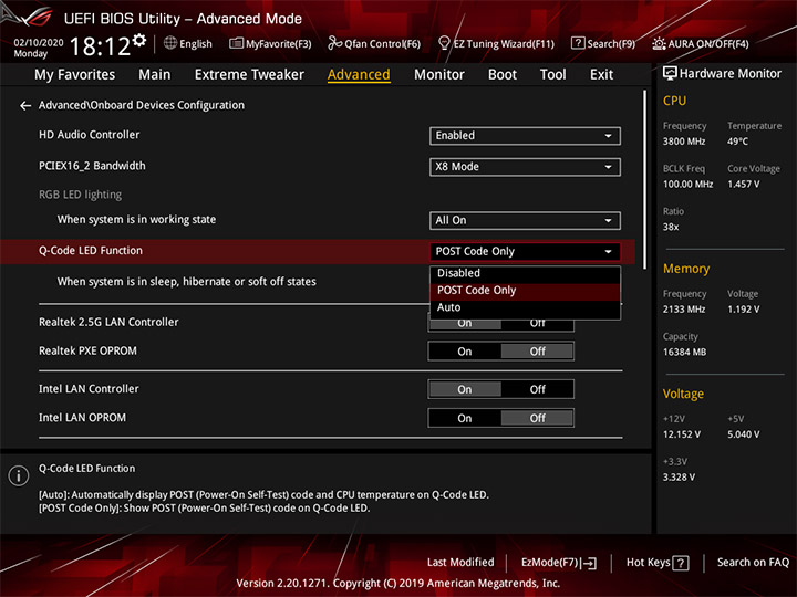 В правом верхнем углу находится зона по управлению устройством. Тут есть кнопка пуска с подсветкой, сброса, индикатор кодов POST с красным оттенком сегментов и многоцветный набор из четырёх светодиодов Q-LED. Настроить демонстрацию температуры процессора или чего-либо другого отчего-то нельзя.