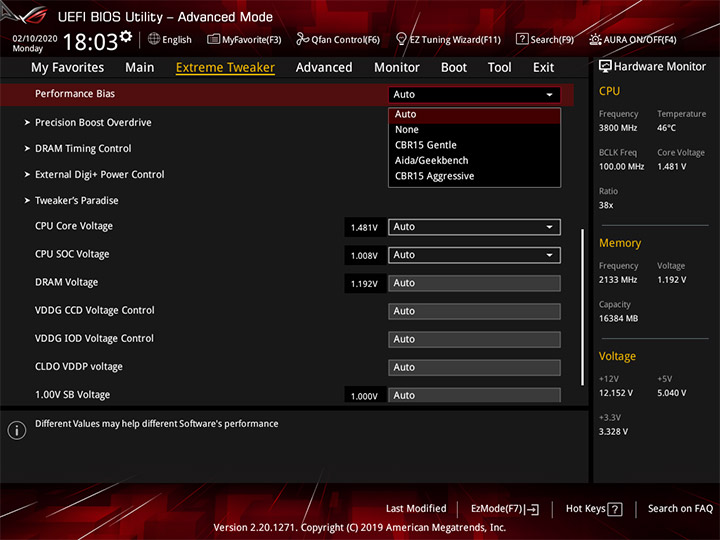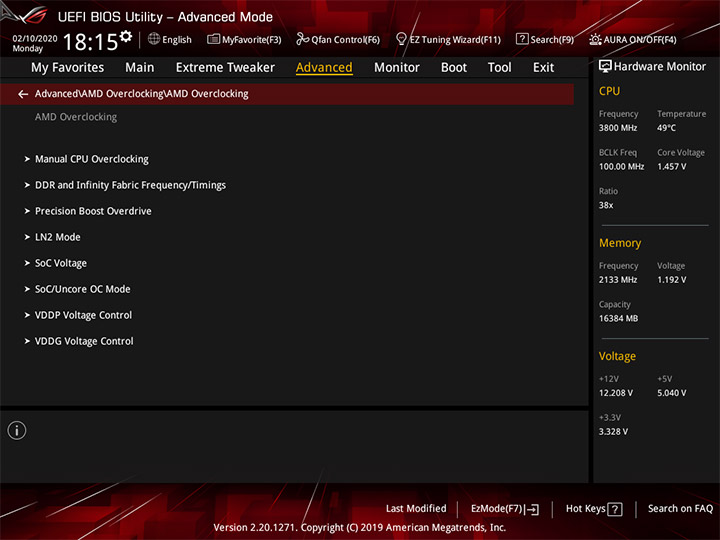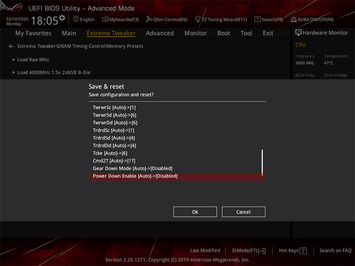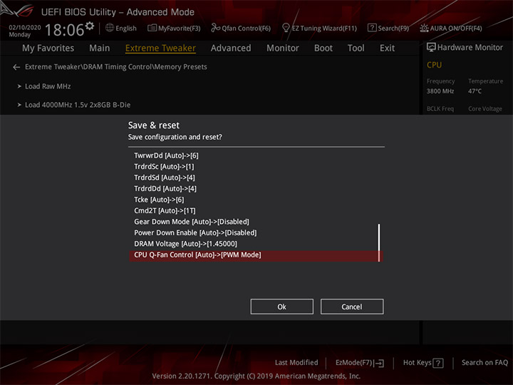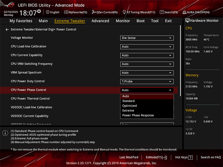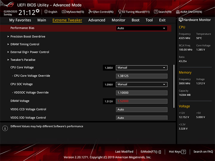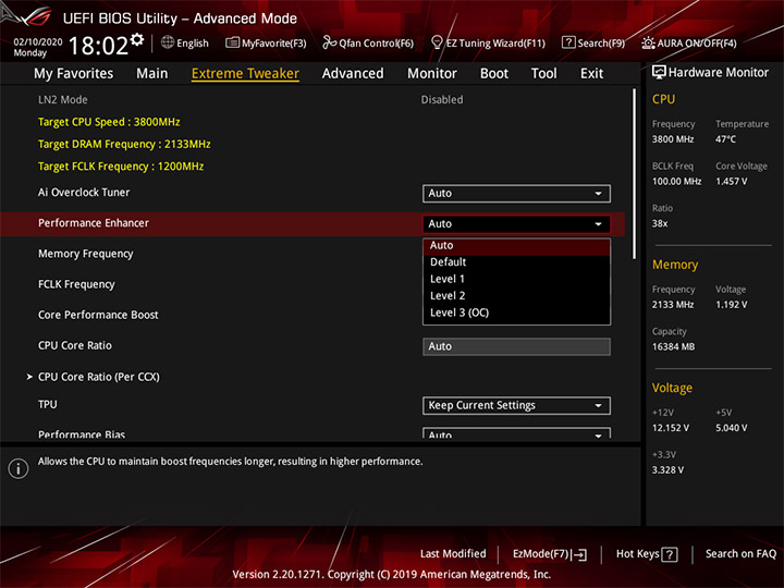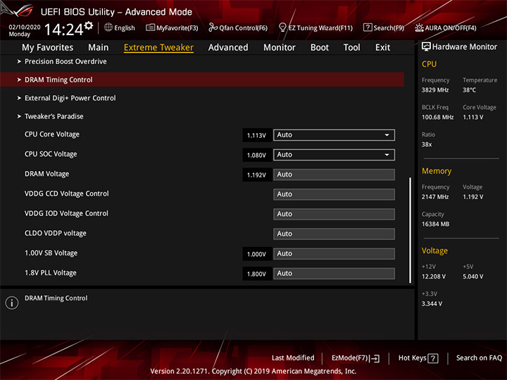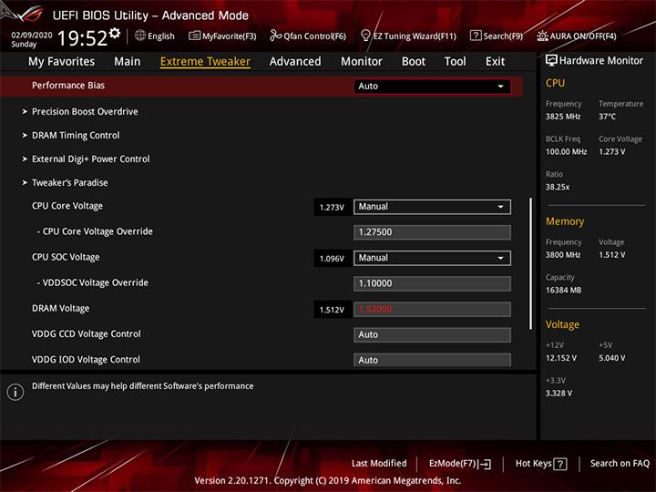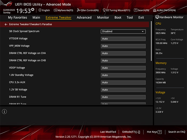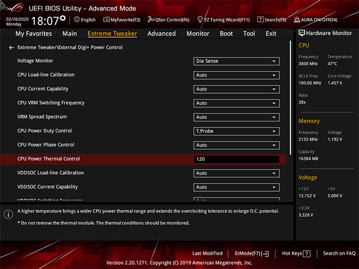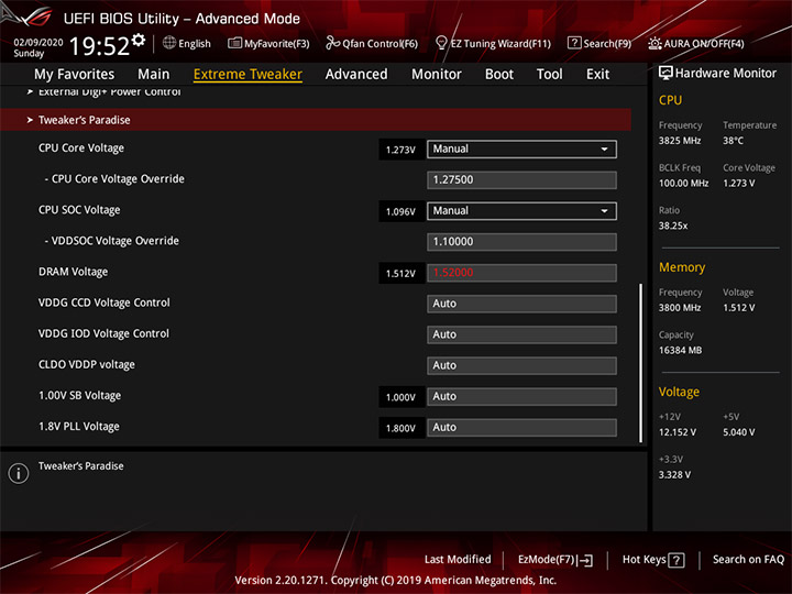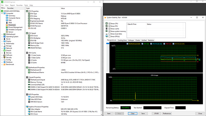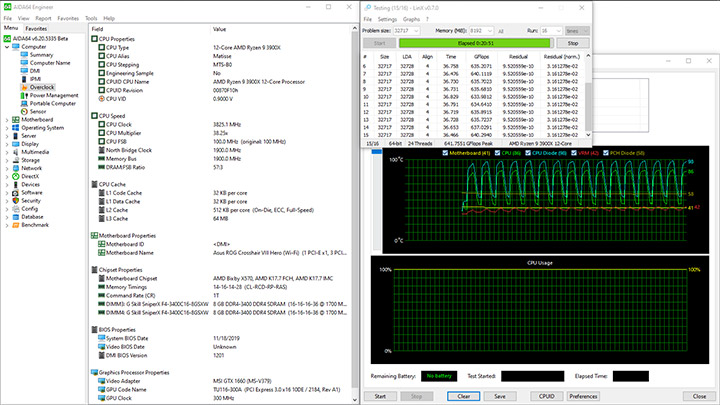 В отличии от подхода, используемого впервые при обзоре ROG Crosshair VIII Formula и далее на большинстве плат, сегодня ради форсажа частоты ОЗУ до 3800 МГц (1:1 с FCLK) вместе с ужатыми задержками понадобилось отказаться от динамической схемы работы ЦП (PBO), равно как это произошло при рассмотрении ASUS ROG Strix X570-I Gaming. Этим произошло объединение и с «тепловым» тестом системы, когда напряжение уровня 1,275 В сочетается с множителем x38.25 под нагрузкой в LinX.