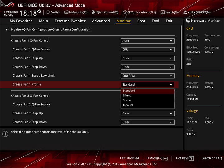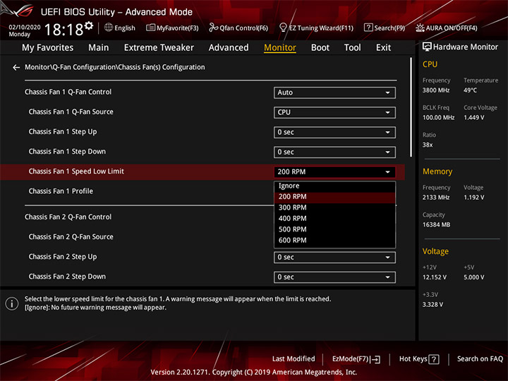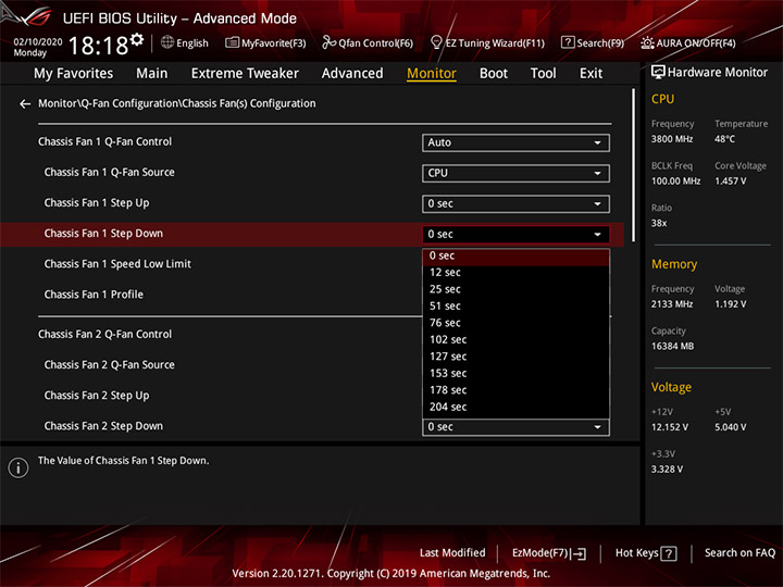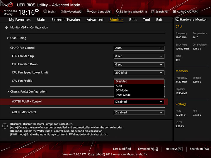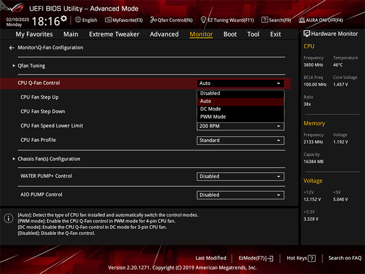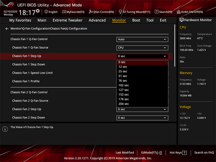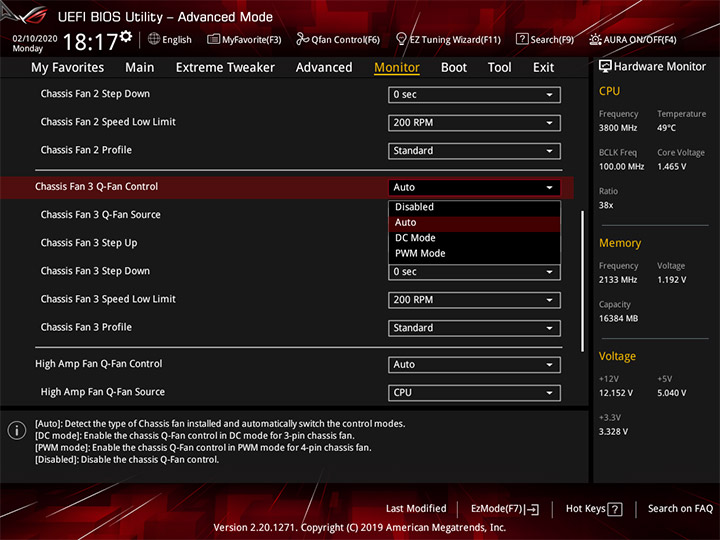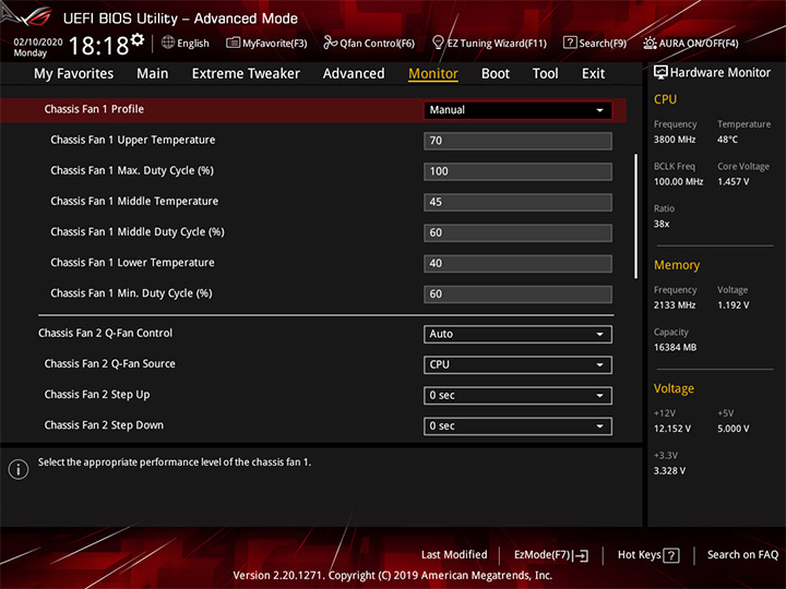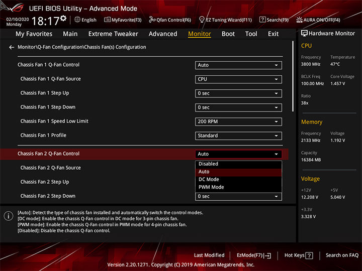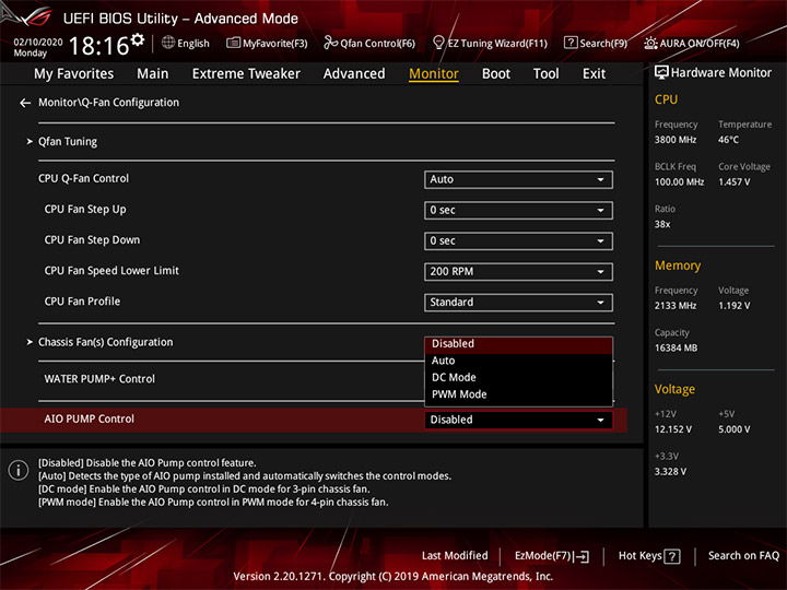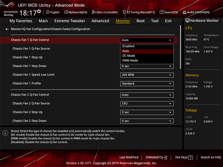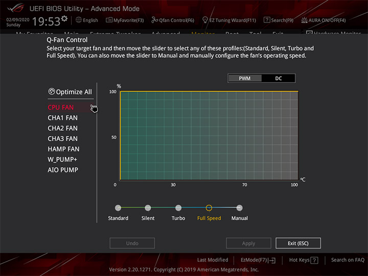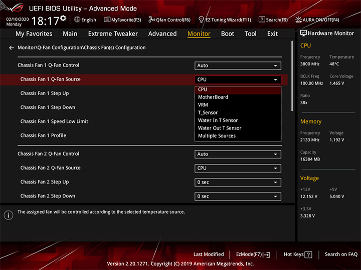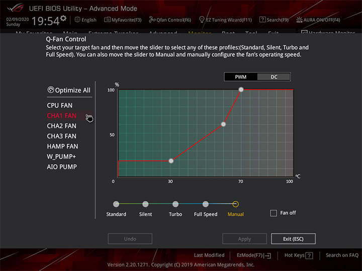Всего доступно четыре температурных отметки сразу после старта работы с системой, а ещё три штуки можно будет добавить, используя внешние сенсоры (выносную термопару и дуэт датчиков из контура СЖО). Сведений о температуре хаба в UEFI нет, равно как отсутствует возможность модификации алгоритма работы охладителя на нём, наблюдать можно лишь за таходатчиком. Для всех прочих площадок под вентиляторы предусмотрен выбор способа замедления скорости — PWM либо DC. У корпусных устройств источником опорной температуры могут выступить сразу несколько штук.
