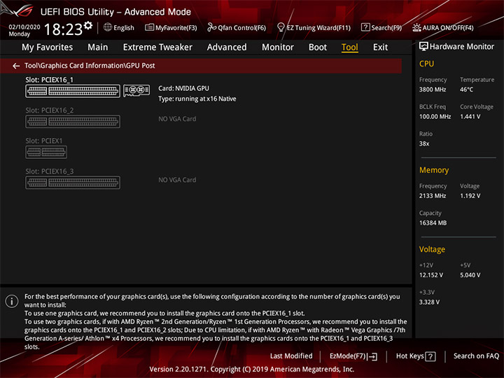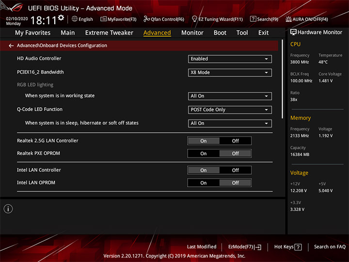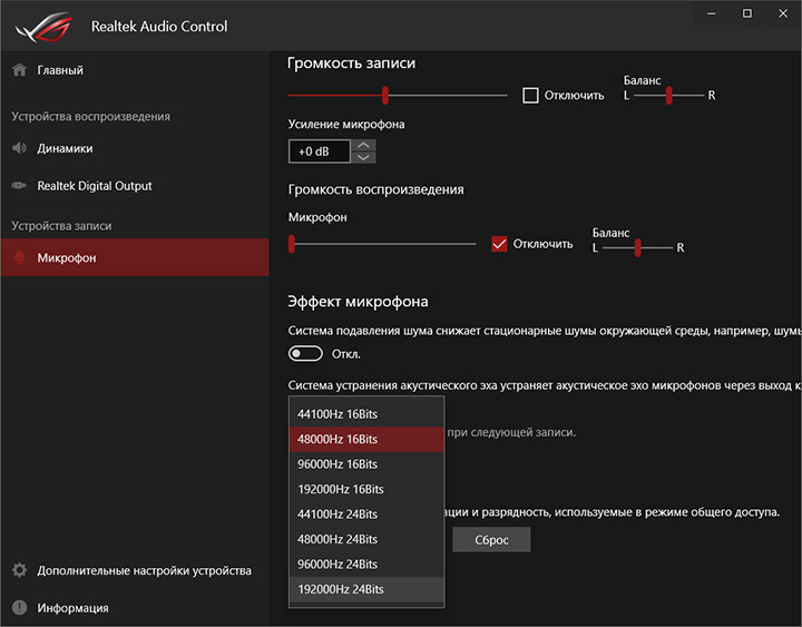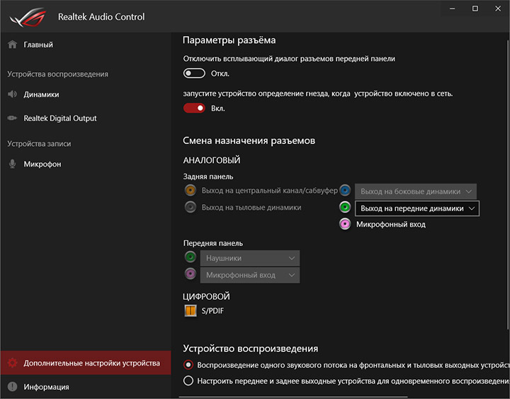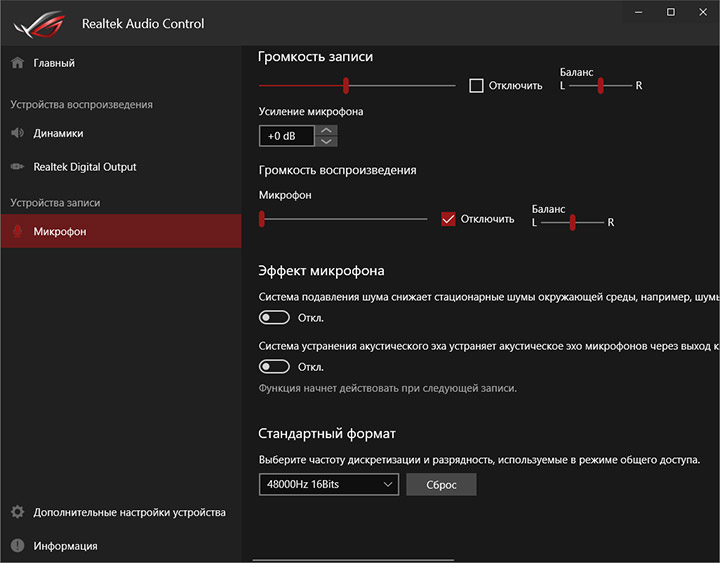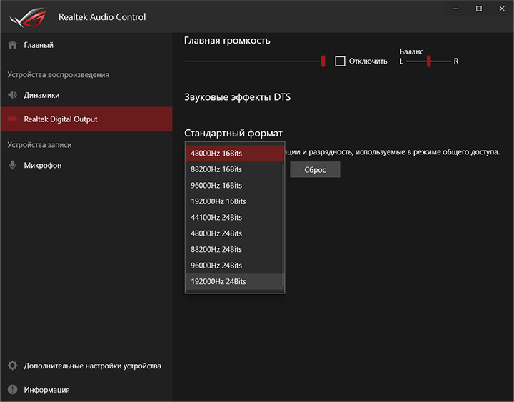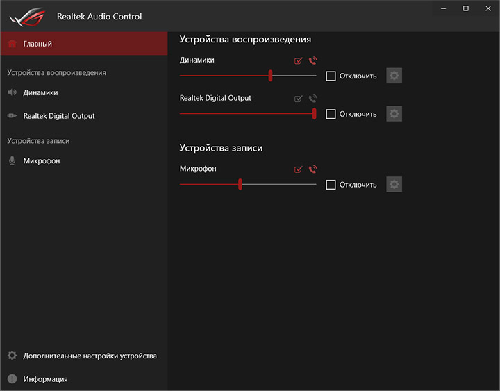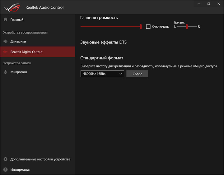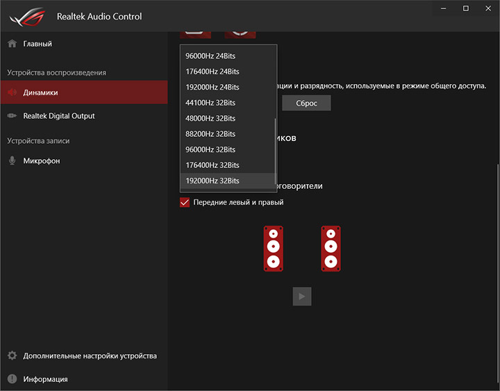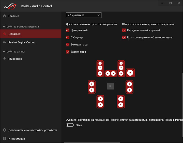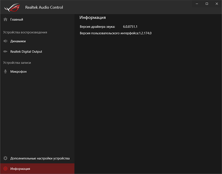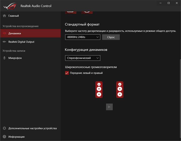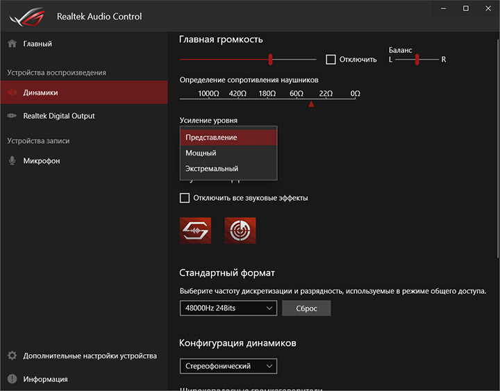 Отладка звуковой составляющей аналогична старшей плате, основа — конфигуратор на базе оболочки Realtek. В наличии три профиля с предусилением выходного сигнала, также доступен выбор между Выходом на передние динамики и Наушниками, он также слегка модифицирует подачу звукового материала. Субъективное мнение о качестве и характере выходного сигнала ничем не отличаются от описанных в обзоре ROG Crosshair VIII Formula ввиду полной идентичности всех составляющих.