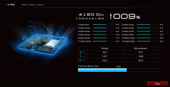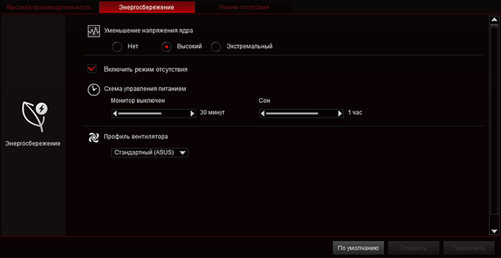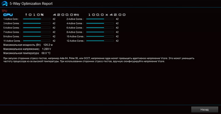 До сих пор фирменные разгонные профили затрагивают исключительно ЦП, даже если проводить операции в несколько этапов, включающих вероятность BSOD и других форс-мажоров, как это подразумевается в составе мастера настройки из состава Ai Suite 3, не говоря уже про арсенал механизмов в UEFI. Да, отдельные схемы для ОЗУ там есть, но до них ещё необходимо добраться, что не каждый энтузиаст сумеет, не говоря уже о более простых пользователях. Получилось ускорить ЦП до 4,2 ГГц в комбинации с выставленным напряжением на уровне около 1,29 В. Это затребовало нескольких перезагрузок ПК. Часть настроек хранится в ОС, в особенности это будет касаться компонентов EPU и Fan Xpert 4, но их я преднамеренно исключил из перечня проводимых «подстроек», чтобы, к примеру, излишне замедленный процессорный вентилятор не ухудшил поведение ЦП. Впрочем, мастер и без того самостоятельно активировал профиль Высокой Производительности в роли схемы Электропитания Windows.