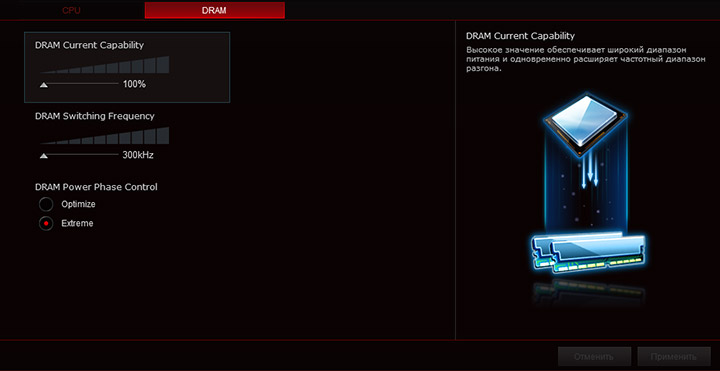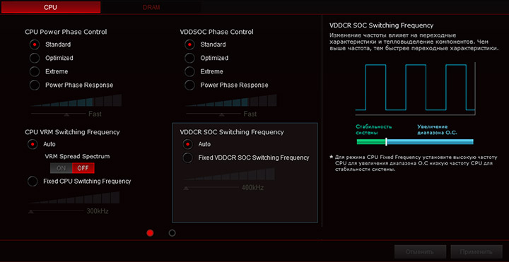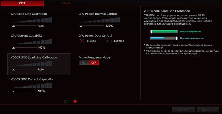 Страница с настройками подсистем питания процессора и памяти пестрит различными пунктами.