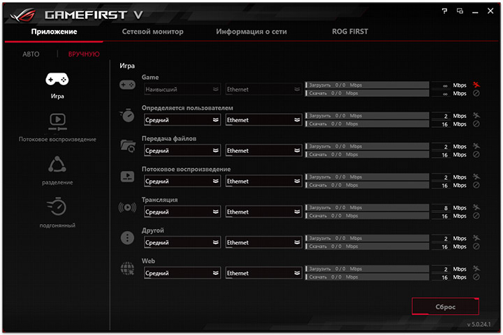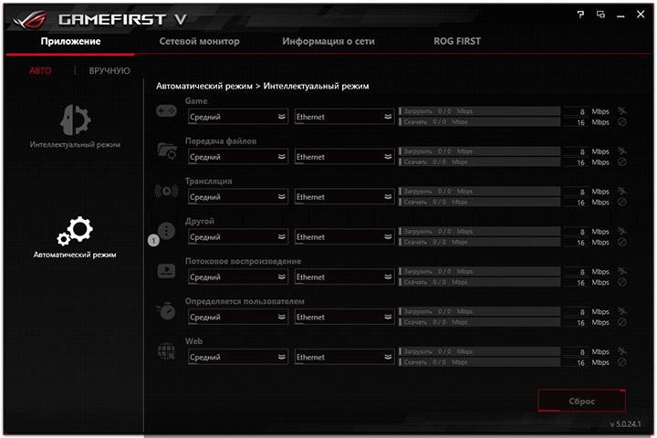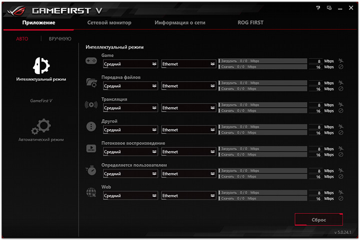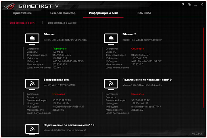Сетевая инфраструктура дополняется программой с названием GameFirst V, основанной на cFosSpeed. Тут есть поддержка всех трёх сетевых адаптеров.