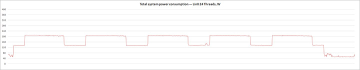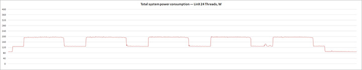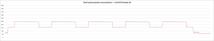 Фиксированный уровень напряжения выдаёт цифра минимального потребления стенда — 88 Вт, а предельная наоборот стала меньше, имеем круглые 200 Вт, что на добрый десяток единиц меньше по сравнению лишь с активированным XMP.