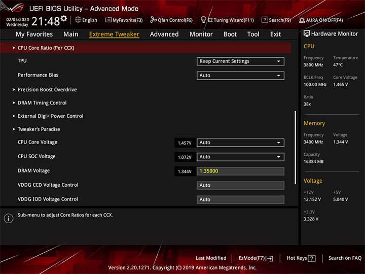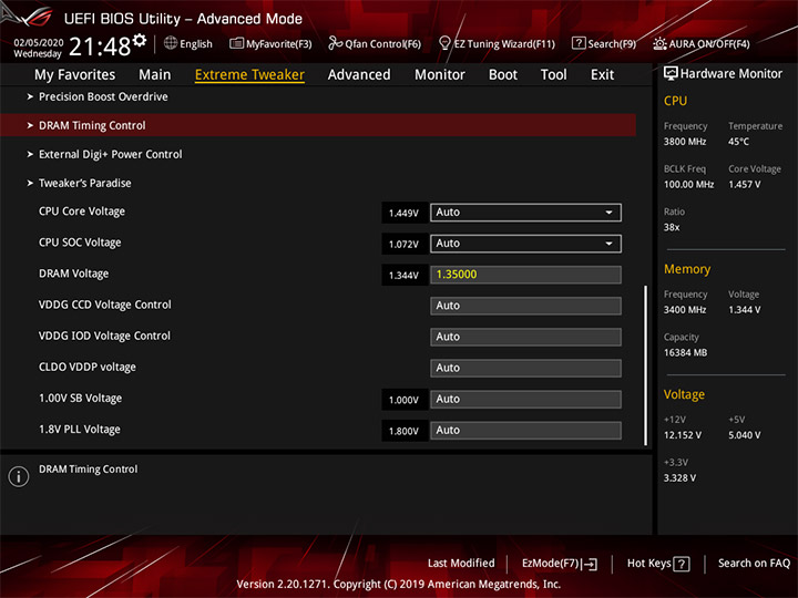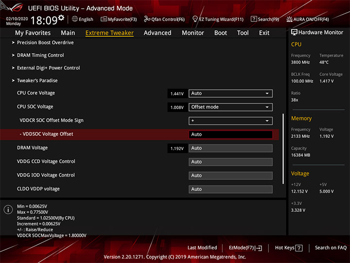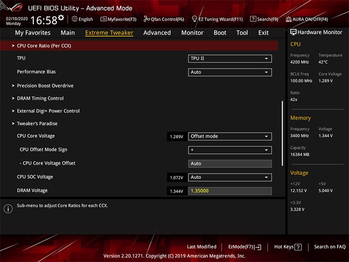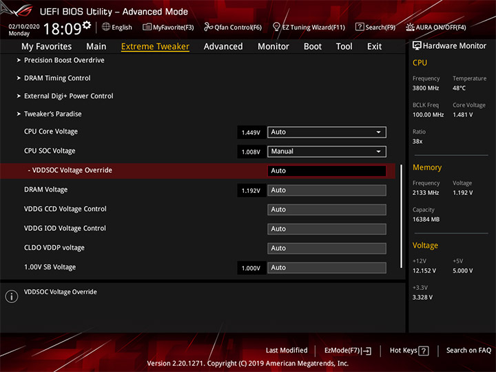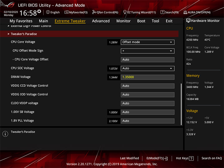 Ускорим память до паспортных 3400 МГц, её напряжение вырастет до 1,344 В, а SOC Voltage составит 1,072 В.