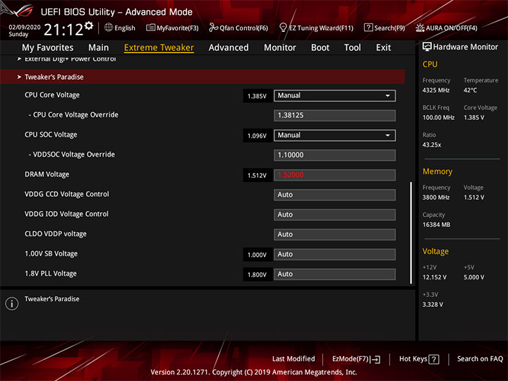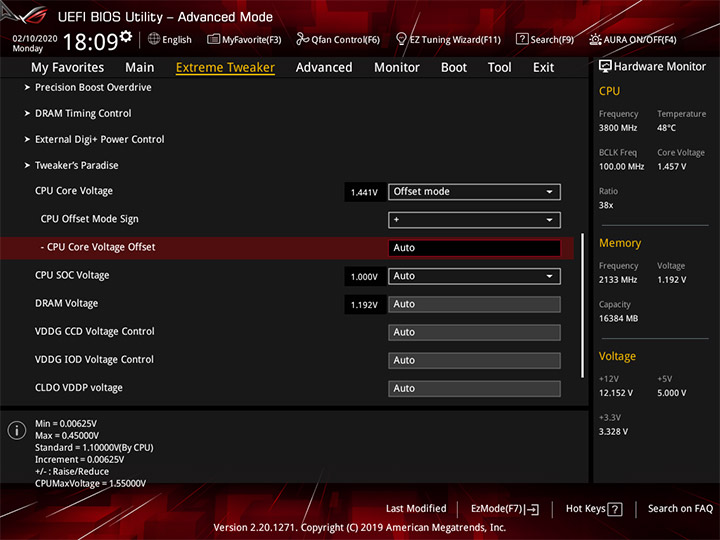 | CPU Core Voltage Override (В) | 0,75–1,70 | 0,00625 |