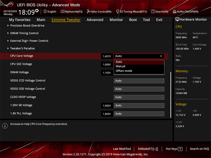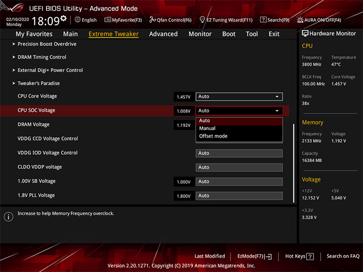 Напряжение CPU и SOС может быть модифицировано двумя способами (manual и offset).