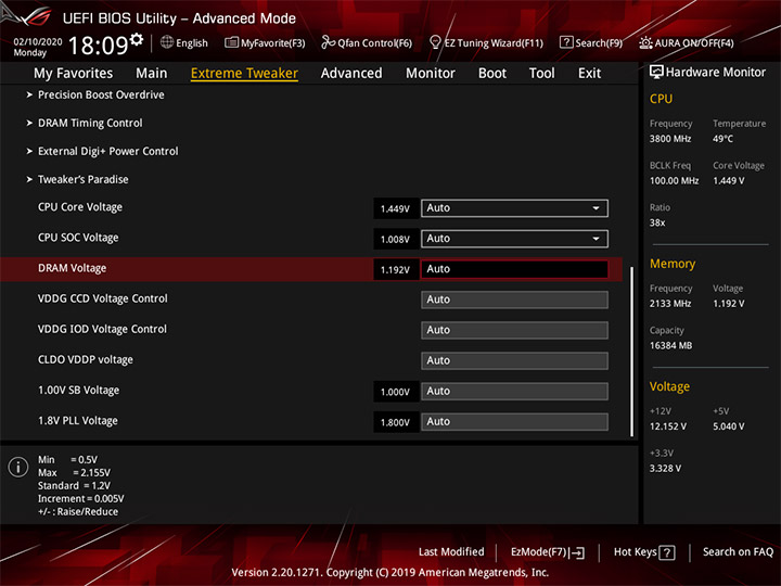| DRAM Voltage (B) | 0,5–2,155 | 0,005 |