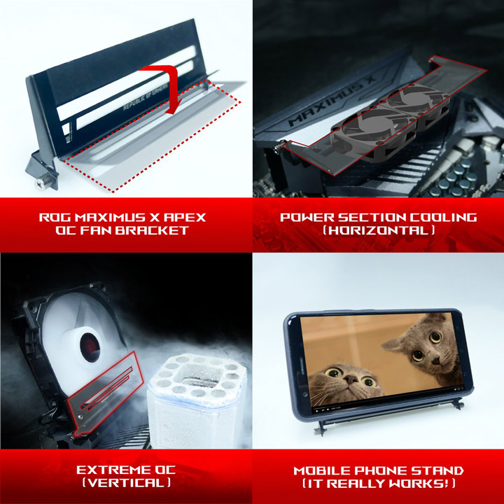 | Дополнительные возможности | ROG Water Cooling Zone (поддержка датчика потока и пары температурных), 3D Print ready (наличие отверстий для крепления продуктов из 3D-принтеров), 2x Thermal sensor connector, контакты для измерения напряжения, поддержка AMD 4-Way CrossFireX и NVIDIA 2-Way SLI, Q-LED (CPU, DRAM, VGA, Boot Device LED), POST-индикатор, кнопки: Start, Reset, MemOK!, ClrCMOS и другие; переключатели состояний: Slow Mode, LN2 Mode, линий PCI-E и прочие; технологии: Lighting Control Center (система подсветки ROG Aura, включая две пары Aura RGB Strip Header), USB BIOS Flashback и прочие |