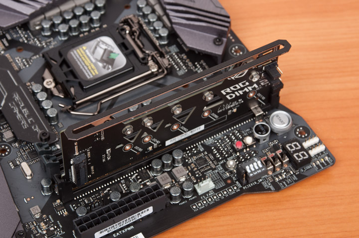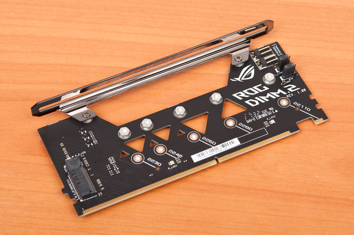 Компактный переходник для устройств M.2, устанавливаемый рядом с модулями памяти, уже был включён в комплект предшественницы. В этой версии здесь же реализовали и подключение пары выносных датчиков температуры, кроме того, иллюминацию можно включать-отключать путём фиксирования положения у перемычек.