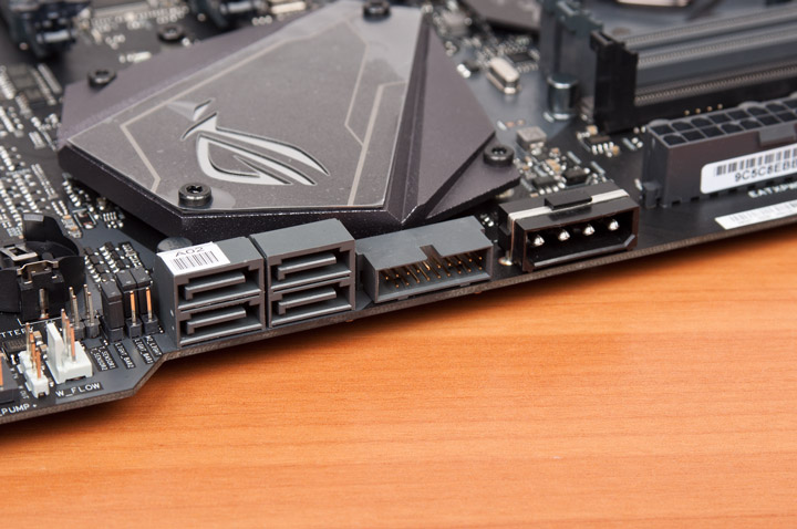 Немалая часть диодов отключается изменением позиции перемычек, на снимке видно, как одна из трёх (ответственная за подсветку сектора среди слотов PCI-E) как раз находится в таком положении. Гнёзд SATA всего четыре.