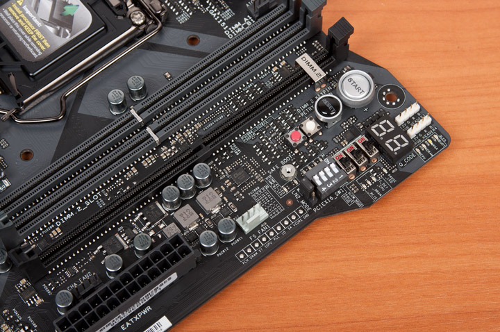 Но уже на самой плате находится довольно богатый узел по управлению состоянием устройства и немалым числом сопутствующих индикаторов. Также заготовлена панель с точками для замера системных напряжений.