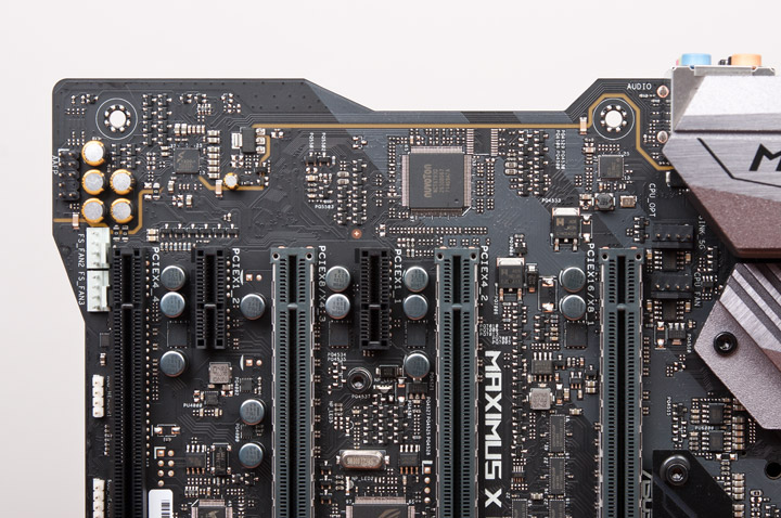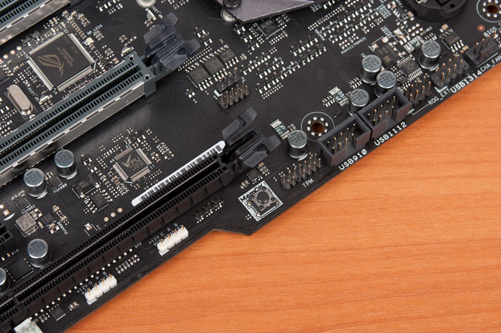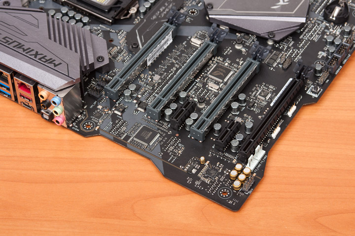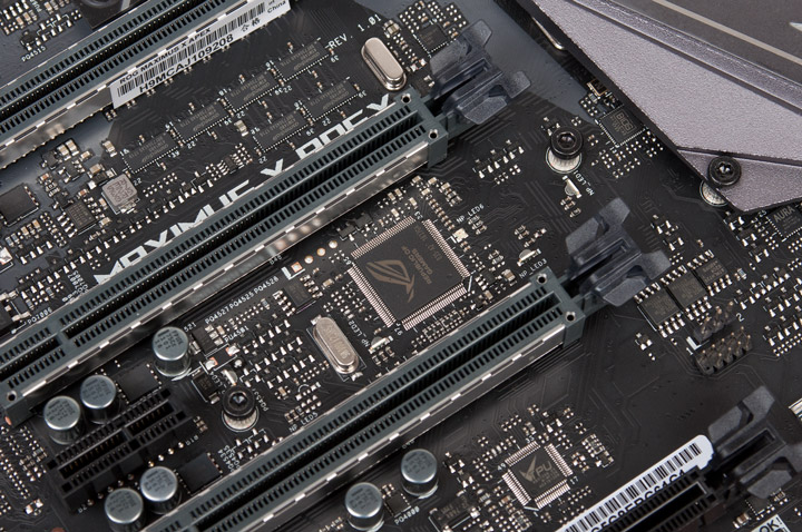 Деление шестнадцати процессорных линий PCI-E может быть проведено между тремя армированными слотами. Последнее из длинных, чёрного цвета, работает с чипсетом.