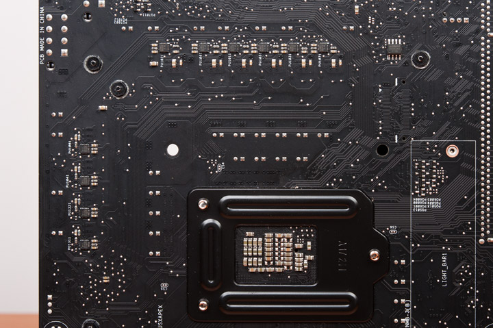 Сзади есть множество электронных компонентов, немалое число находится в секторе VRM, потому следует быть осторожным при эксплуатации ПК в режиме открытого стенда. Инженеры заготовили группы контактных пар, отвечающих за выявление конденсата. Для визуализации этого процесса есть три светодиода, расположенных в области управления платой (на лицевой части).