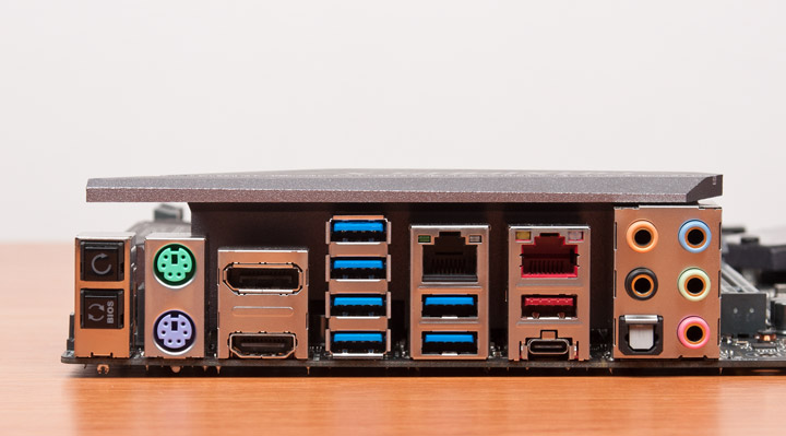 Было бы уместно, на мой взгляд, каким-либо способом объединить возможности охладительных элементов, но инженеры поступили иначе, разместив на плате независимые радиаторы. Накладка над портами задней панели весьма массивная, но её способности пригодятся лишь для пятигигабитного сетевого адаптера нового поколения.