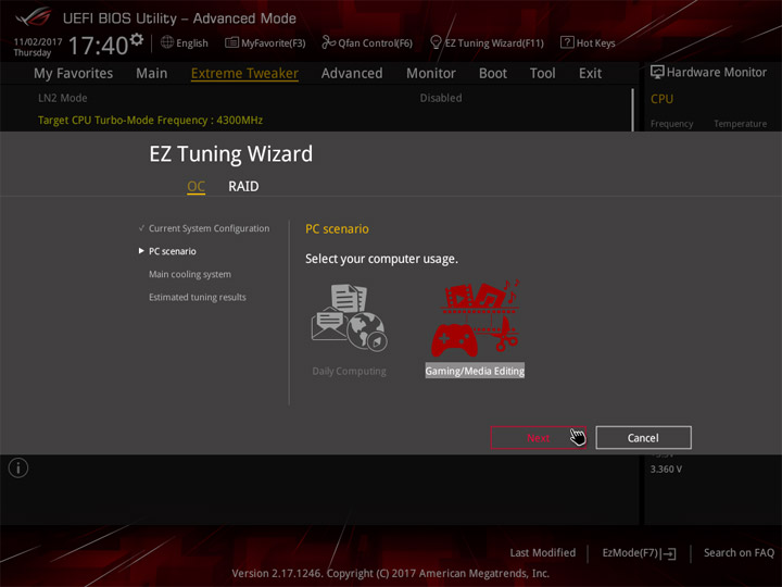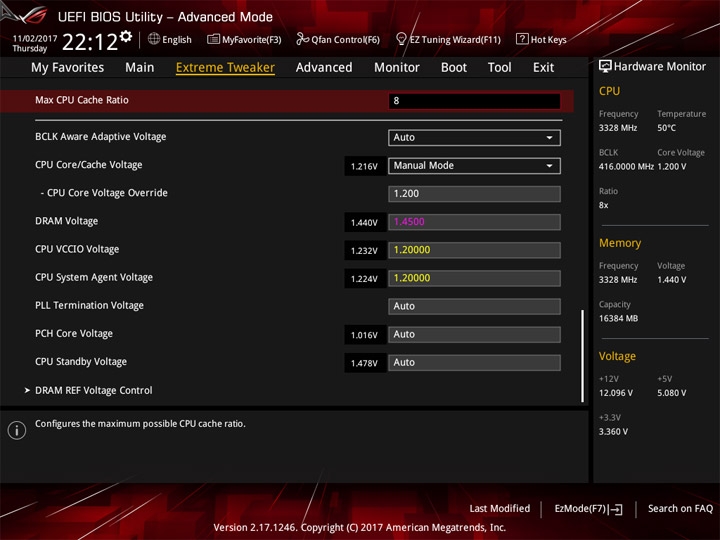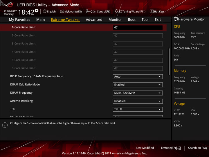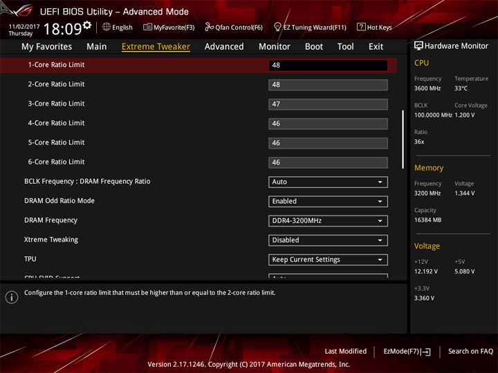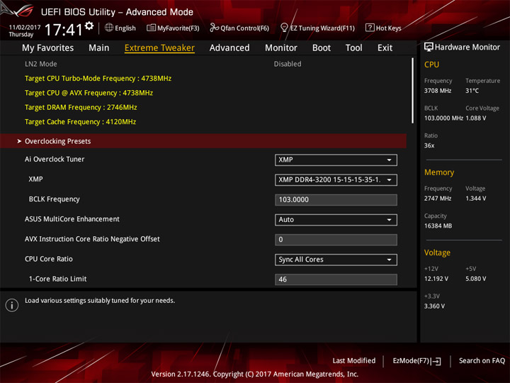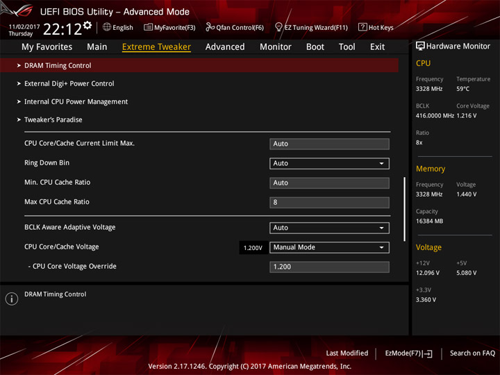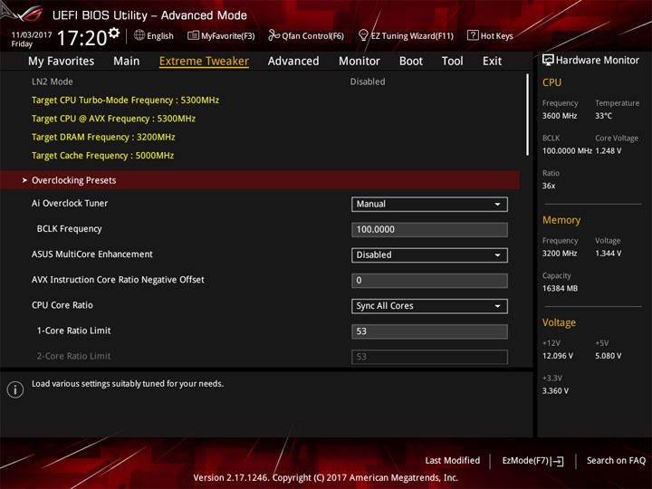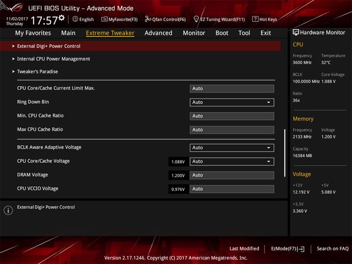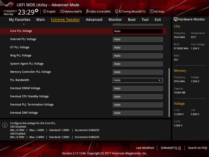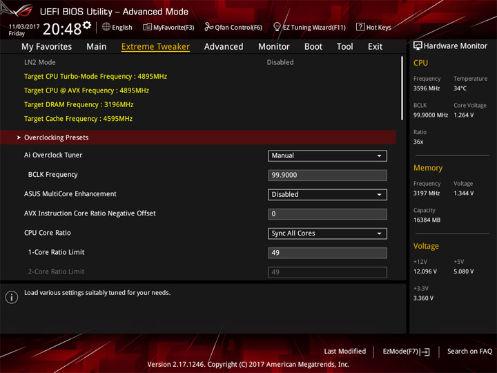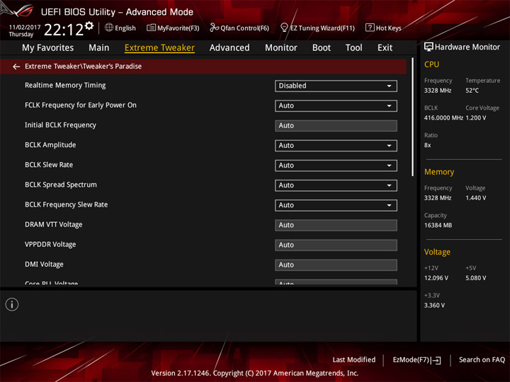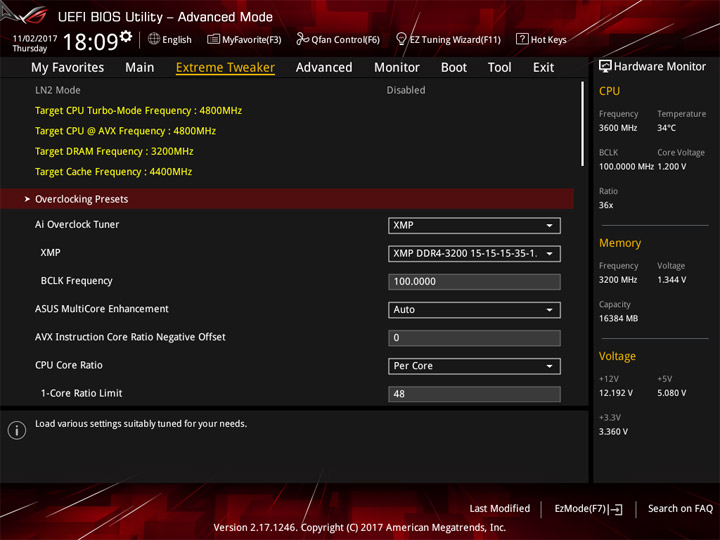 В наборе пунктов раздела Extreme Tweaker есть глава с готовыми профилями по оверклокингу разной направленности: CPU, DRAM, BCLK. Тонкие настройки находятся в Tweaker’s Paradise. Границы выставляемых напряжений можно расширить, активировав (на плате) режим LN2.