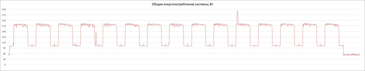 Замеры выполнялись после прохождения всех прочих тестов в «устоявшемся» режиме компьютера при помощи прибора собственной разработки. Для создания нагрузки использовался профиль In-place large FFTs в составе утилиты Prime95 (29.3). Производился расчёт среднего значения потребления тестового стенда «от розетки» на протяжении восьми минут работы программы, а затем, после завершения теста, ещё минуту замерялся уровень, соответствующий состоянию простоя системы.