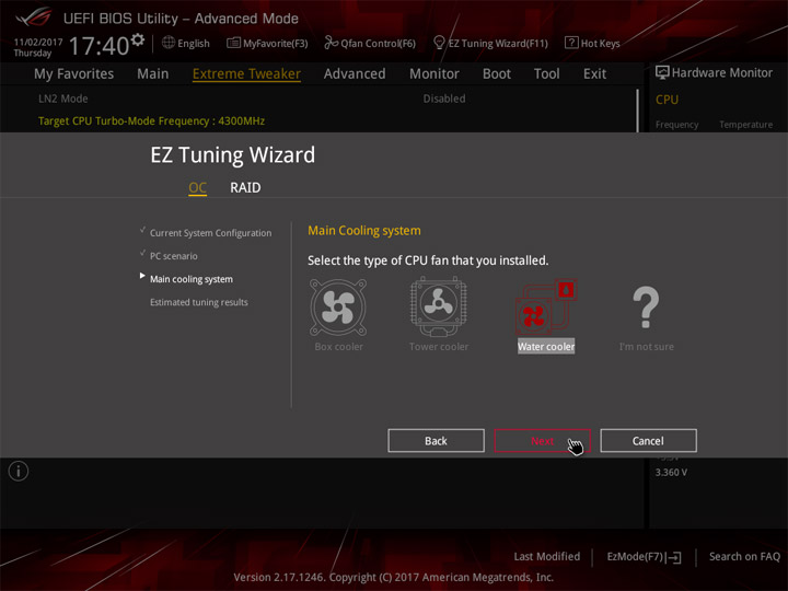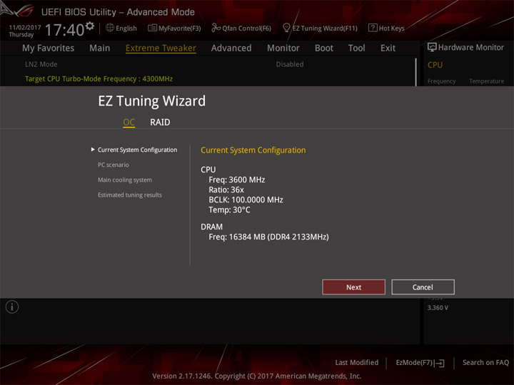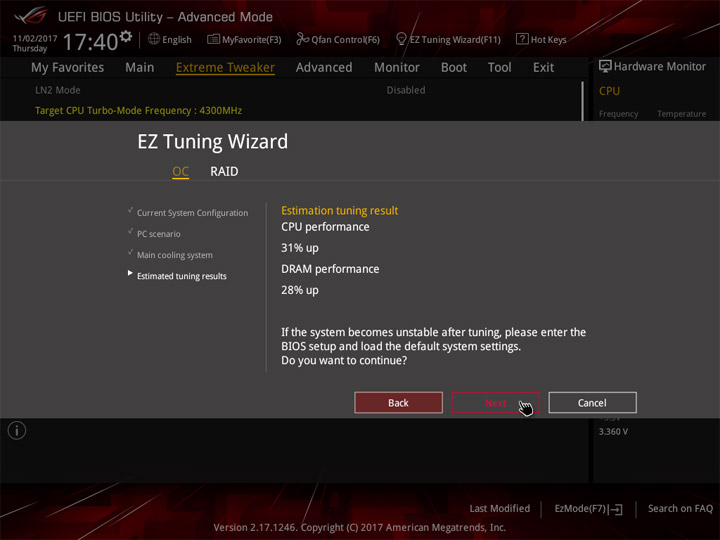 Сперва изучим поведение устройства при использовании готовых профилей. Самый агрессивный сценарий Ez Tuning Wizard работает так же, как на уже рассмотренной нами ASUS ROG Strix Z370-E Gaming. Процессор разгоняется до 4738 МГц, а память — до 2746 МГц. Схема задержек берётся из профиля XMP, напряжения SA и IO растут также, как и при обычной активации XMP — до 1,15 В.
