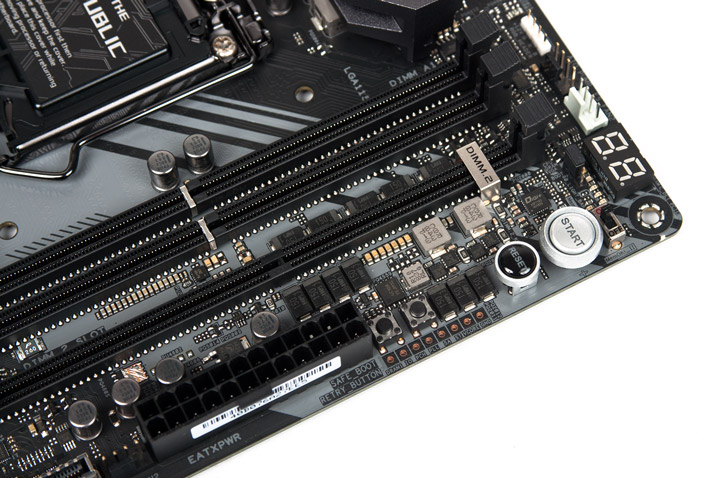 Справа вверху находится основной узел управления устройством. Тут распаяли четыре кнопки, включая Retry и Safe Boot. Имеются площадки для аппаратных замеров действующих напряжений. Диагностический комплекс основан на комбинации набора светодиодов Q-LED и индикатора кодов POST. Для технологии MemOK! выбран переключатель, а для указания спецрежима LN2 — перемычка.