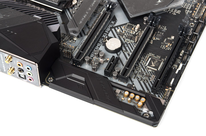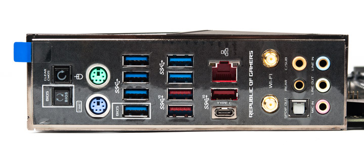 На задней панели пустых мест нет. Наполнение схоже с существующим у ROG Maximus XI Extreme, вот только выдеовыход и второй порт Ethernet здесь замещены парой PS/2 ввиду отсутствия поддержки iGPU и отказа от дополнительного сетевого контроллера. Для реализации работы беспроводной сети используется тот же узел.