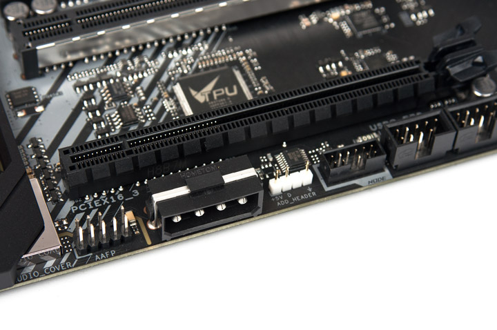 Усилить питание слотов при разгоне видеокарт призван добавочный элемент в виде четырёхконтактного гнезда типа «Molex».