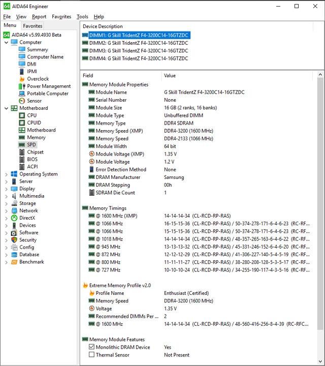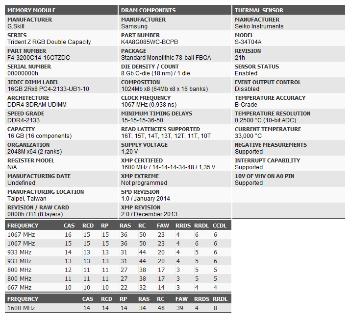 Для каждого из четырёх «субмодулей» характерен не только отдельный набор профилей, но и собственный термодатчик, состав — шестнадцать чипов Samsung C-die, компоновка — двухранговая.