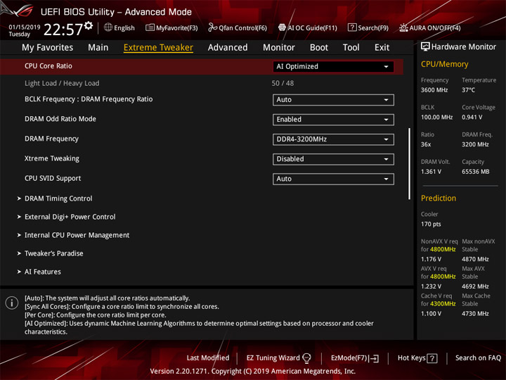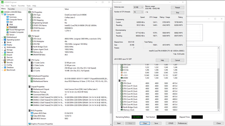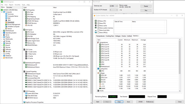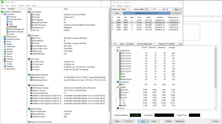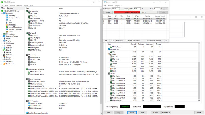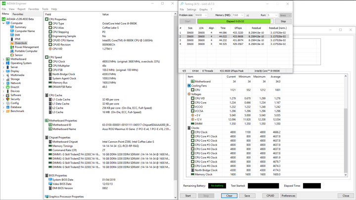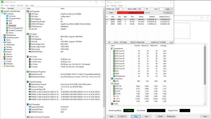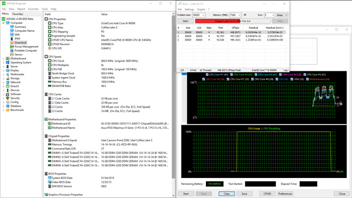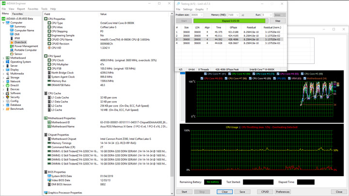 С лёгкими тестами всё хорошо, чего не сказать про LinX. Шестнадцатипоточный тест ПК провалил, с восемью всё было отлично — процессор не перегревался, работая на частоте 4800 МГц, а при этом память была тоже ускорена (до 3200 МГц). Производитель заявляет (в справочных полях UEFI) про самообучаемый набор механизмов Ai Features. Кто знает, быть может, несколько BSOD и «прогноз» (Prediction) был бы снижен до меньших отметок (либо высокие частотные уровни стали сопровождаться возросшим напряжением). В любом случае, говорить про идеальную реализацию инженерами максимума уже не получается. Систему придётся взять под чуткий контроль, хотя единожды настроить её правильно будет разумнее, чем ожидать прозрения от неких Ai-алгоритмов.