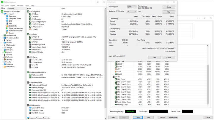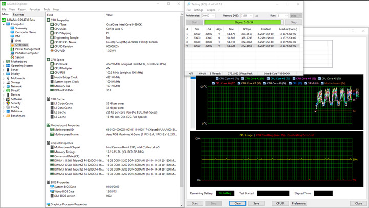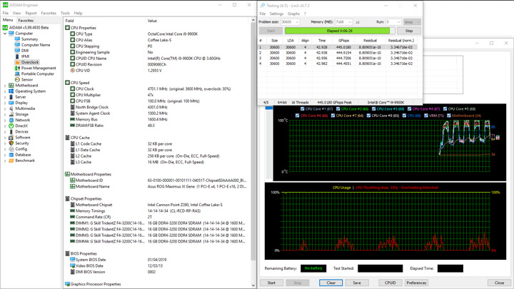 Ход выполнения сценариев отличался стабильностью, но чудовищный нагрев ЦП в результате ускорения ОЗУ нельзя не заметить. LinX вместе с активным статусом MCE доводят ядра до серьёзного разогрева, из-за чего троттлинг активируется фактически сразу (хотя результаты замеров быстродействия пострадали всего единожды — в самом конце тестов, это факт). Отказ от ускорений (MCE) меняет функционирование системы до неузнаваемости, частота с 4,7 ГГц падает до 3,6 ГГц (а то и ниже) буквально с момента запуска серьёзных нагрузок. Конечно же, при этом речь о перегреве уже идти не будет.