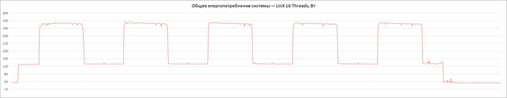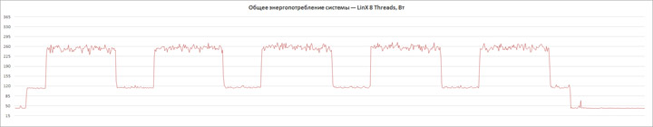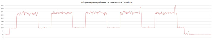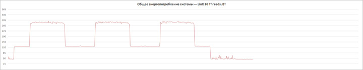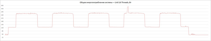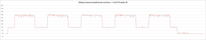 Удивительно ровными выглядят графики кривых потребления энергии, достаточно трудно объяснить, как же сказывается активация троттлинга на системе в целом (и происходит ли она на самом деле). Цифры вышли равными 43–324 и 43–304 Вт.