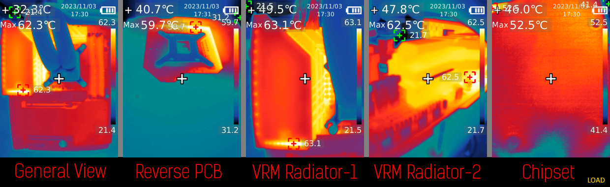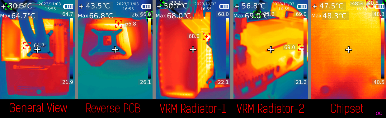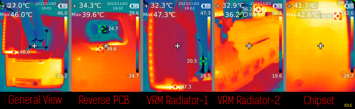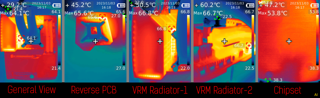 Теперь термофото. Порядок: простой, нагрузка в типовом режиме, нагрузка в режиме AI Optimized, нагрузка в режиме ручного разгона.