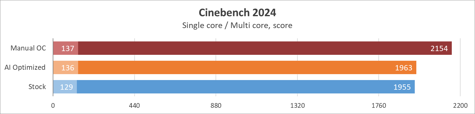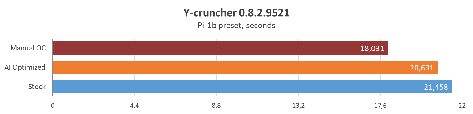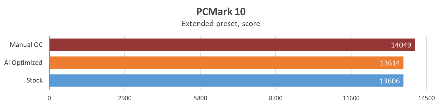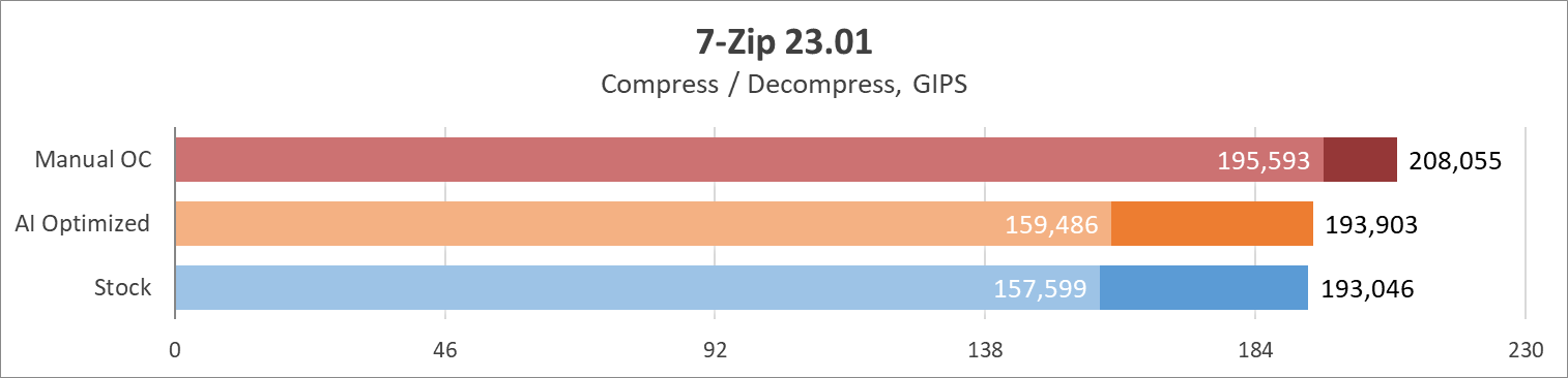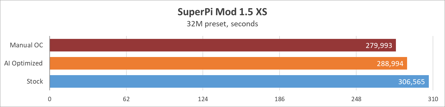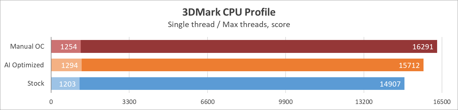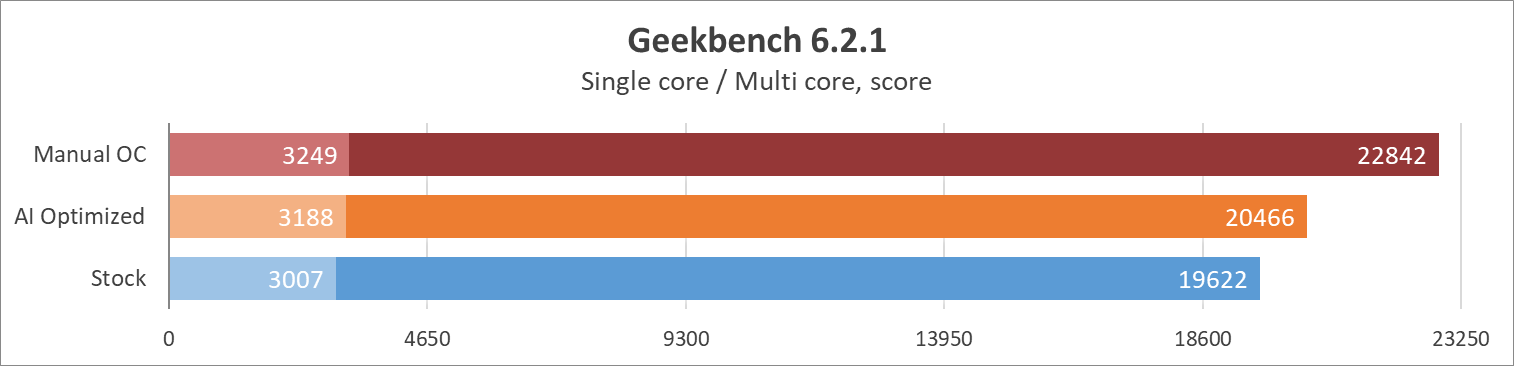 Режим автоматического оверклокинга AI Optimized не трогает оперативную память, настройки касаются только процессора. Теперь средняя частота P-cores и E-cores стала 4909,7 МГц (P-cores = 5821 МГц, E-cores = 4301,9 МГц), при этом максимальное ускорение одного ядра равнялось 6000 МГц.