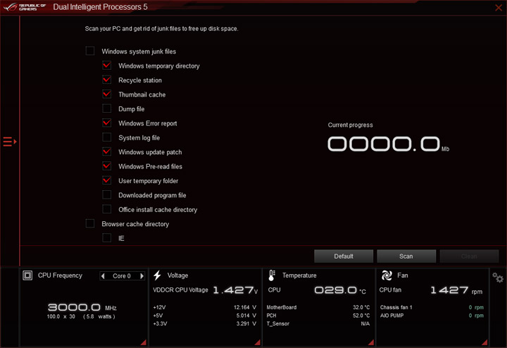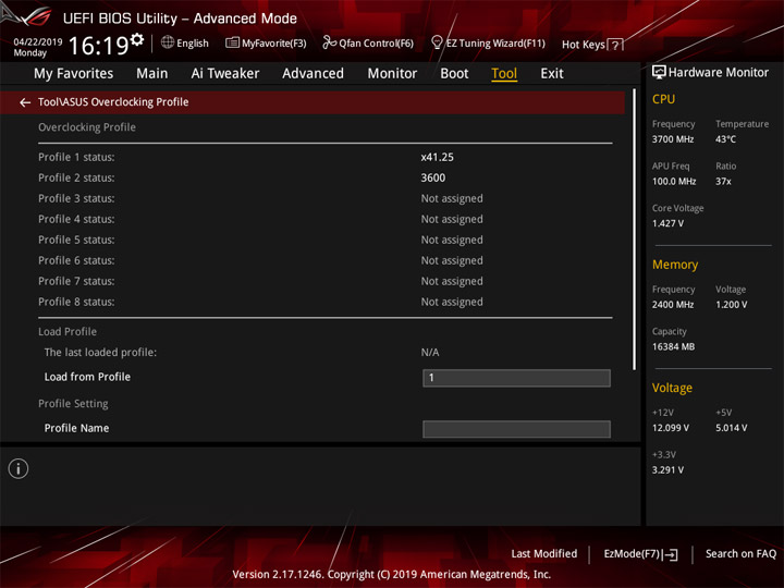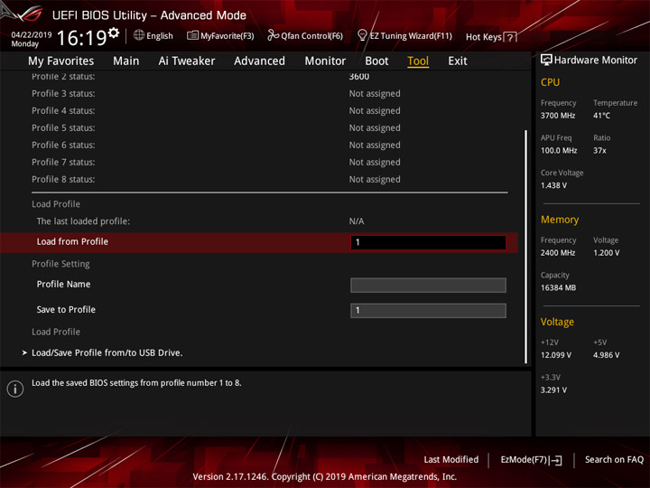 Не обнаружен и ASUS Grid Install Service, виденный в новой модели, в последствии переименованный в Armoury Crate, это система по упрощённой инсталляции драйверов и ПО в среде Windows 10. Остальной инструментарий в разделе Tool идентичный, в частности, имеются восемь интегрированных профилей для хранения настроек.